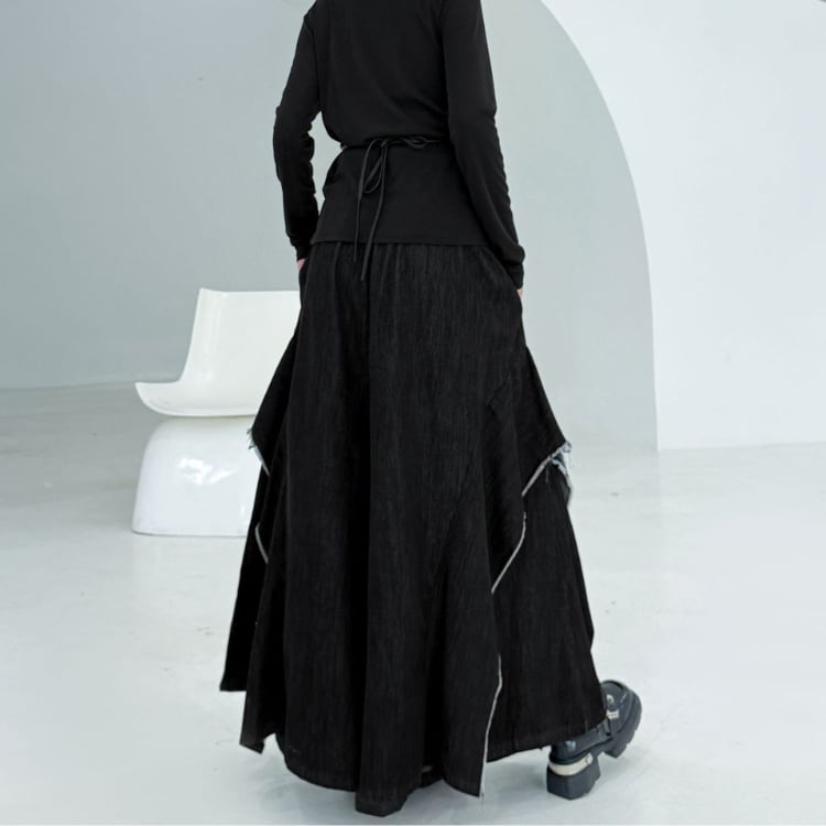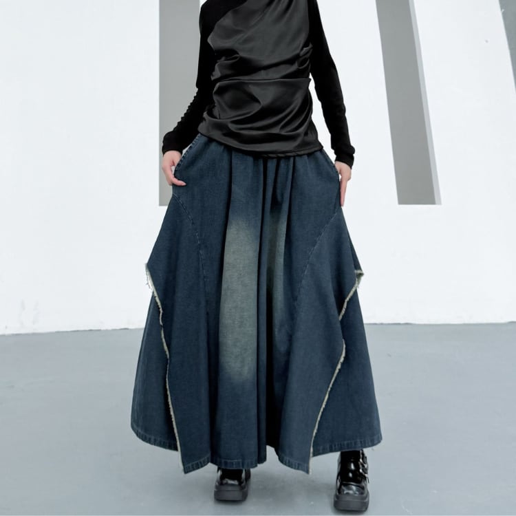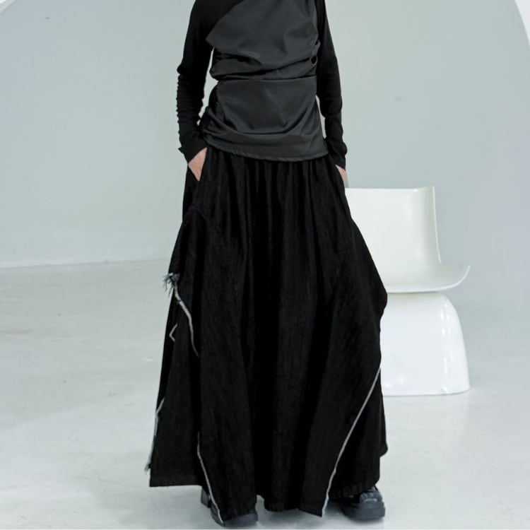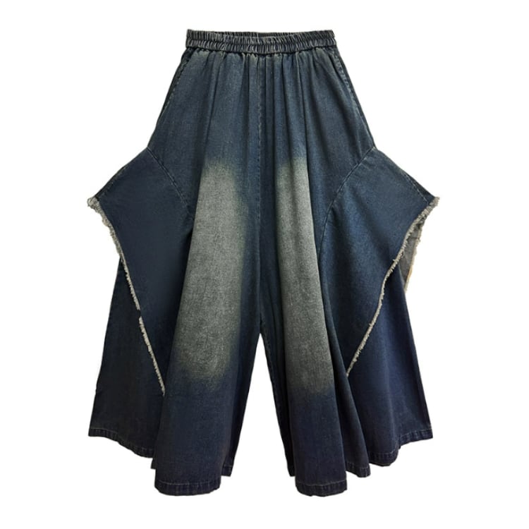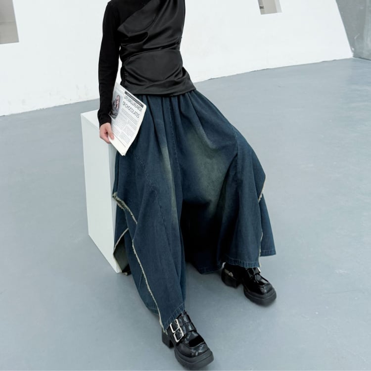 モード感漂うデニム素材のロングボトムスは、スカートのような広がりとパンツの動きやすさを抑えた一着です。 置き続ける風のラフなディテールがアクセントになり、カジュアルながらも洗練された印象を演出。 ウエストはゴム仕様でリラックスした履き心地を叶え、体型を選ばずに着こなせます。