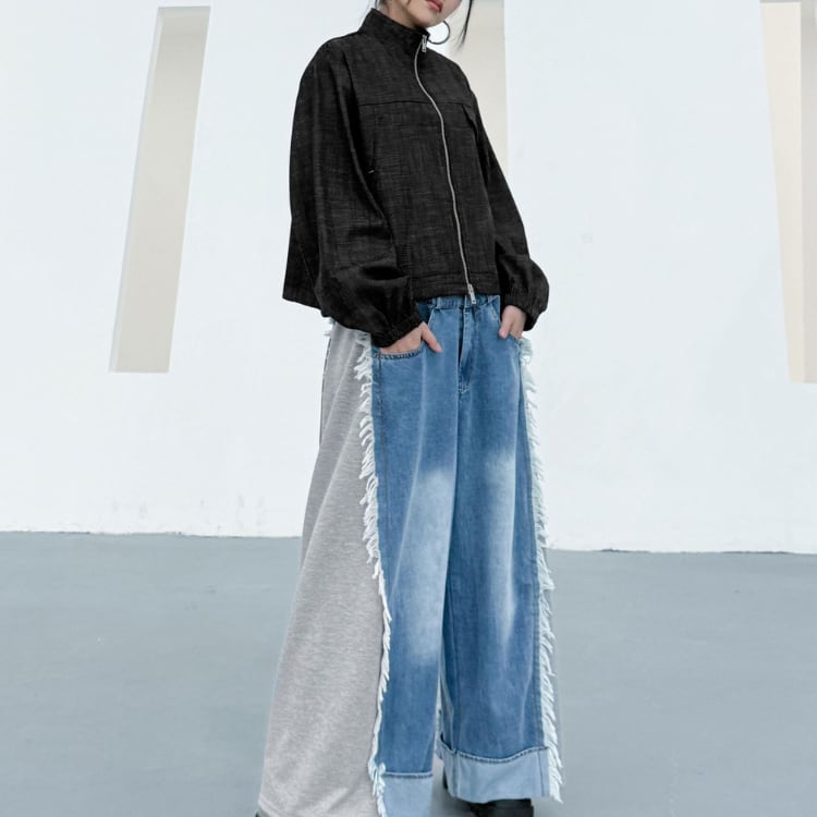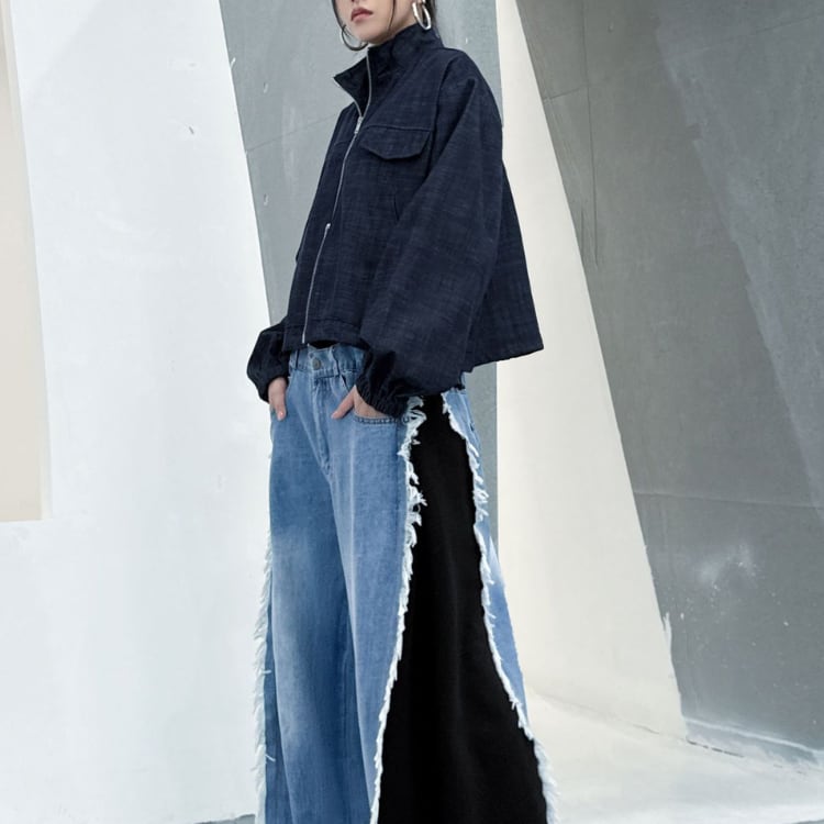 スタンドカラーとワイドシルエットが魅力のヴィンテージライクなデニムジャケットで、ゆるさとモード感を抑えた大人のカジュアルスタイルを演出します。