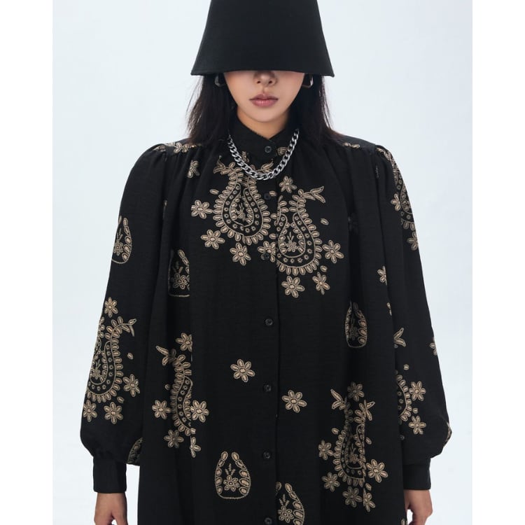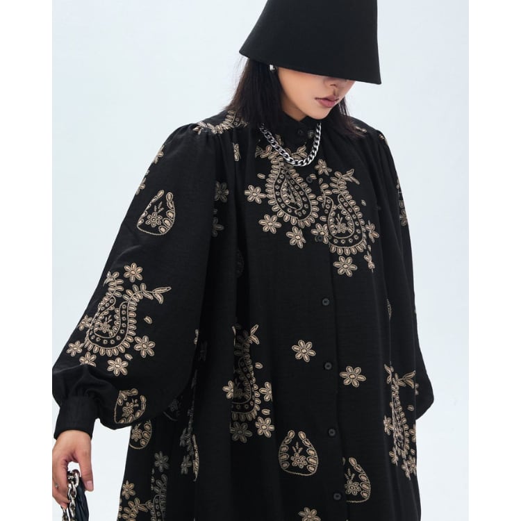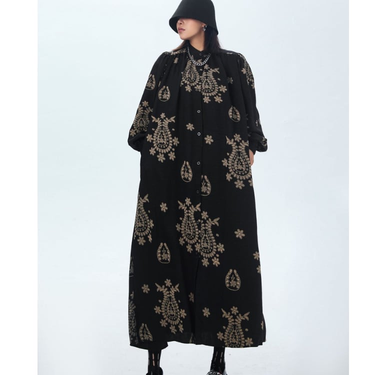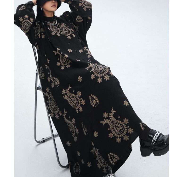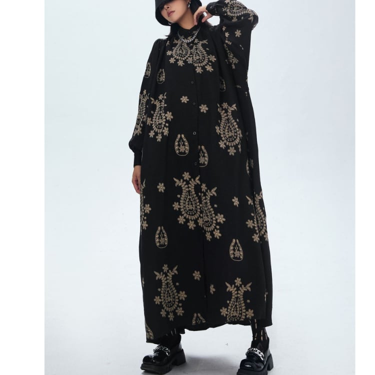 繊細な刺繍を全面に施したスタンドカラーのロングワンピース。 ゆったりとしたデザインのシルエットが体型をカバーしつつ、エレガントな雰囲気を漂わせます。 長袖仕様で秋口から冬までロングシーズン活躍。 モード感とクラシカルな品格を捉えた一着は、日常使いからなシーンまで幅広く着こなせます。