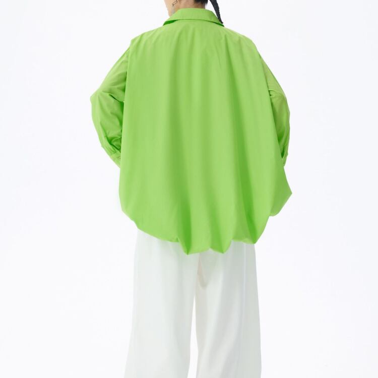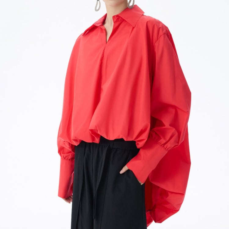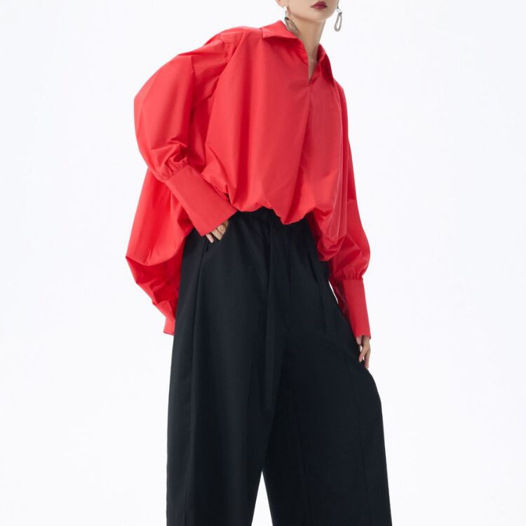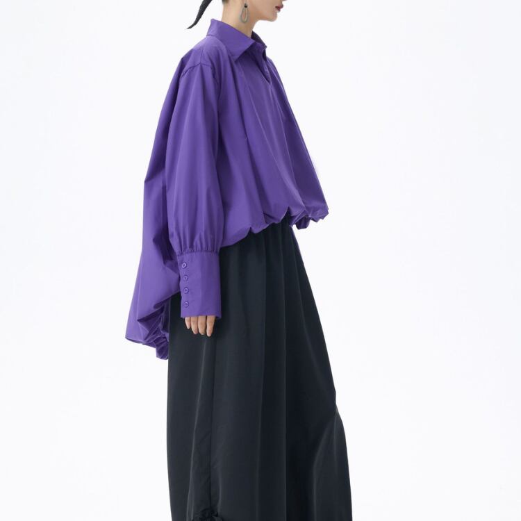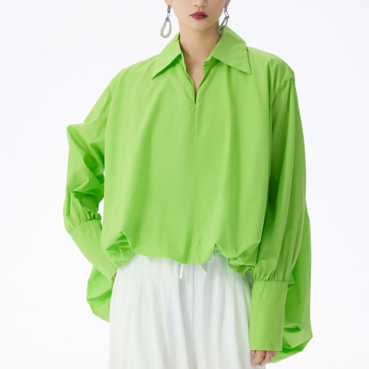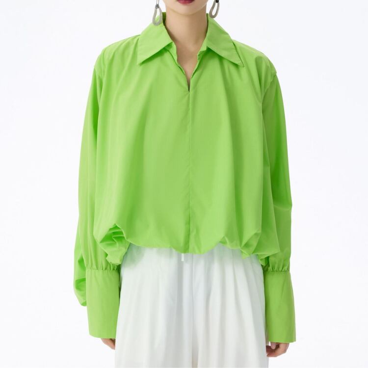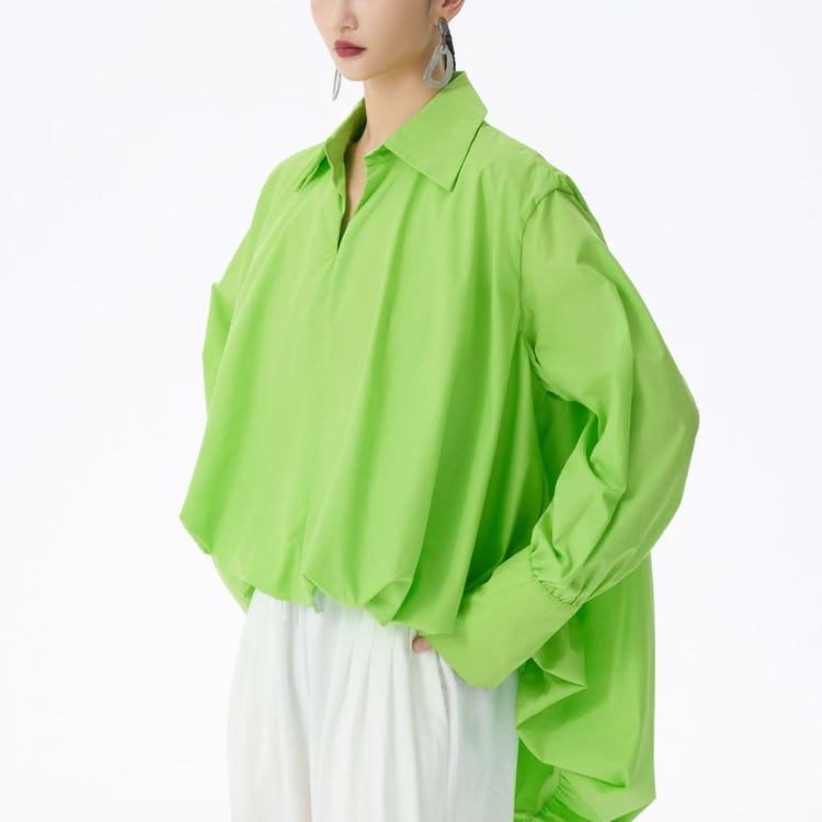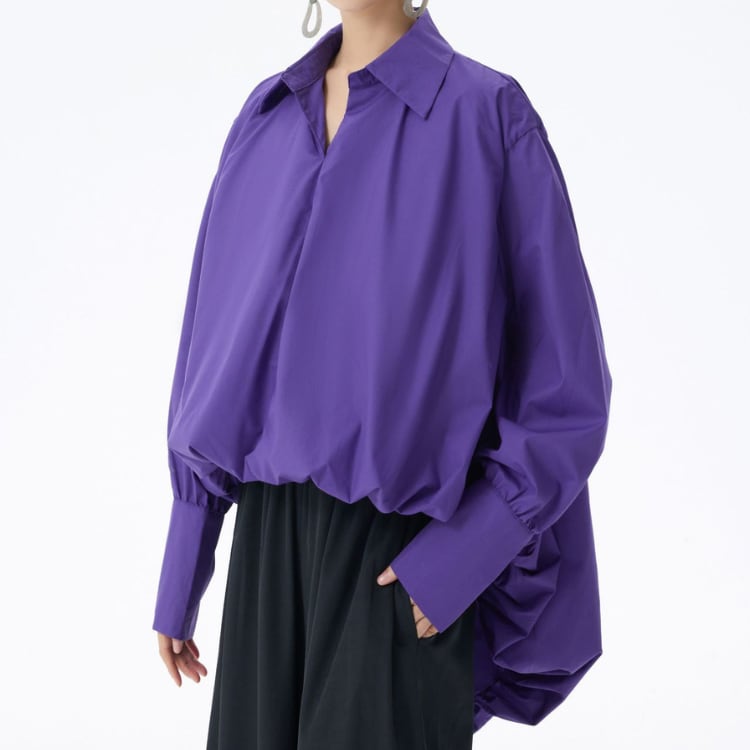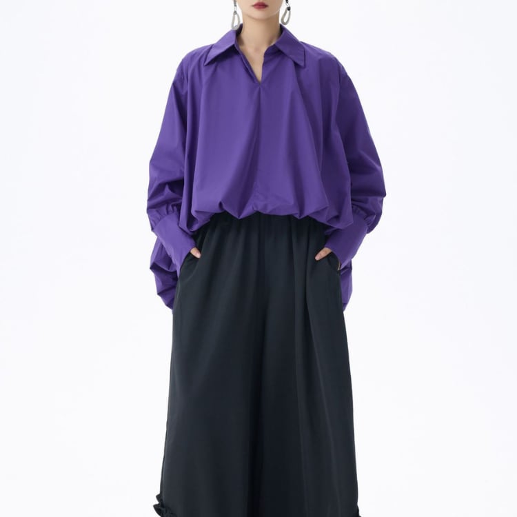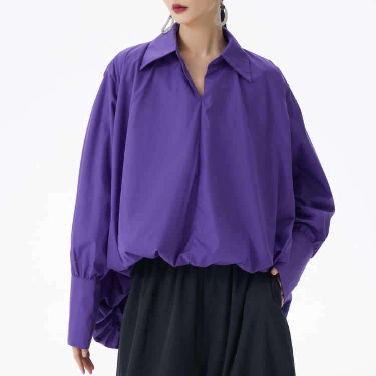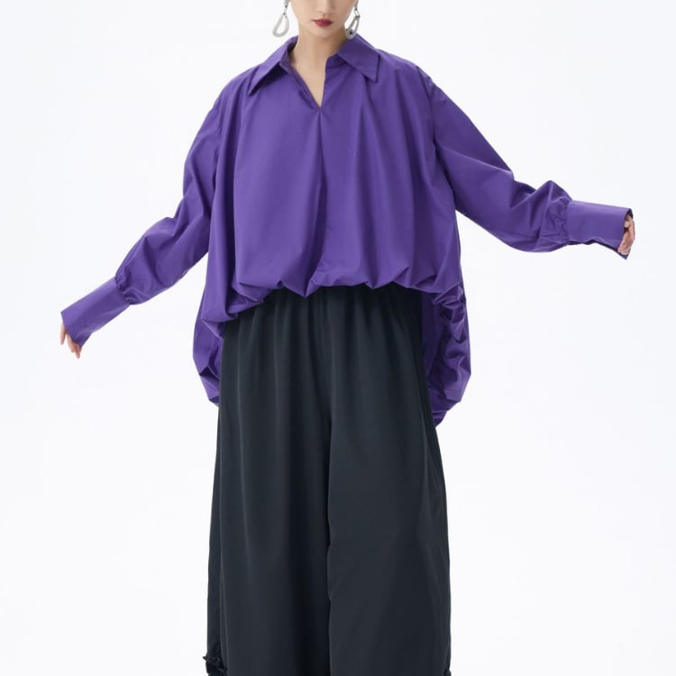 フレンチモードな雰囲気が印象的なVネックシャツブラウスは不規則な裾のタックデザインとゆったりとしたシルエットが特徴で、秋の通勤や日常コーデに個性を添えるモード感あふれる一枚です。