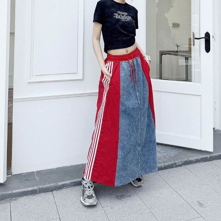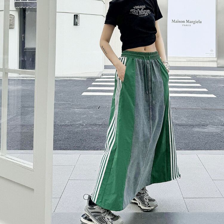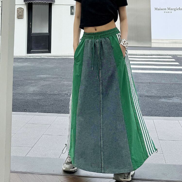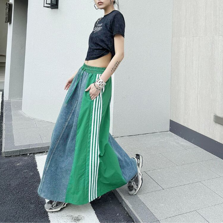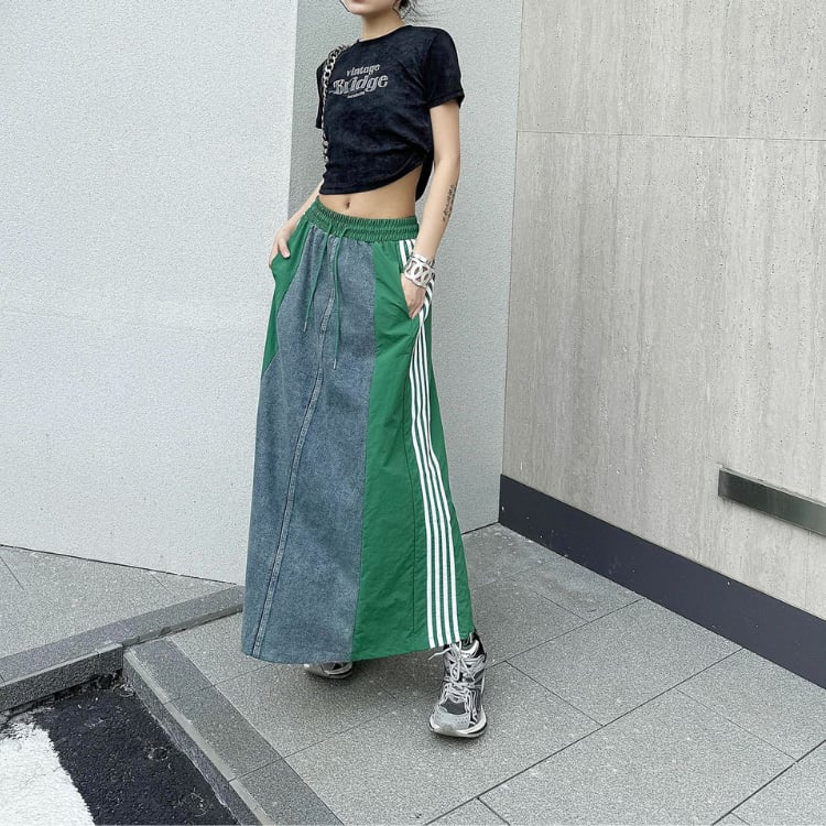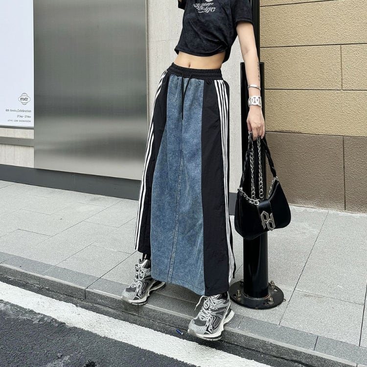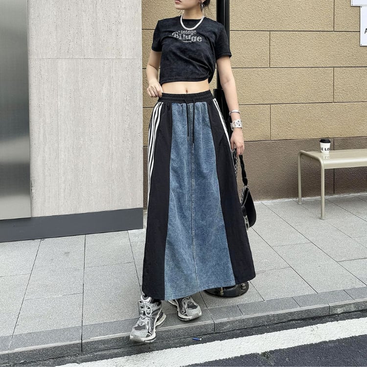 デニム生地とナイロン素材を思い切って切り替えたロングスカート。 ウエストはゴム仕様でラクに着用でき、両サイドのスポーツラインがスタイリッシュなアクセントに。 Aラインシルエットが体型をさりげなくカバーしつつ、モード感とストリート感を押さえた1枚です。