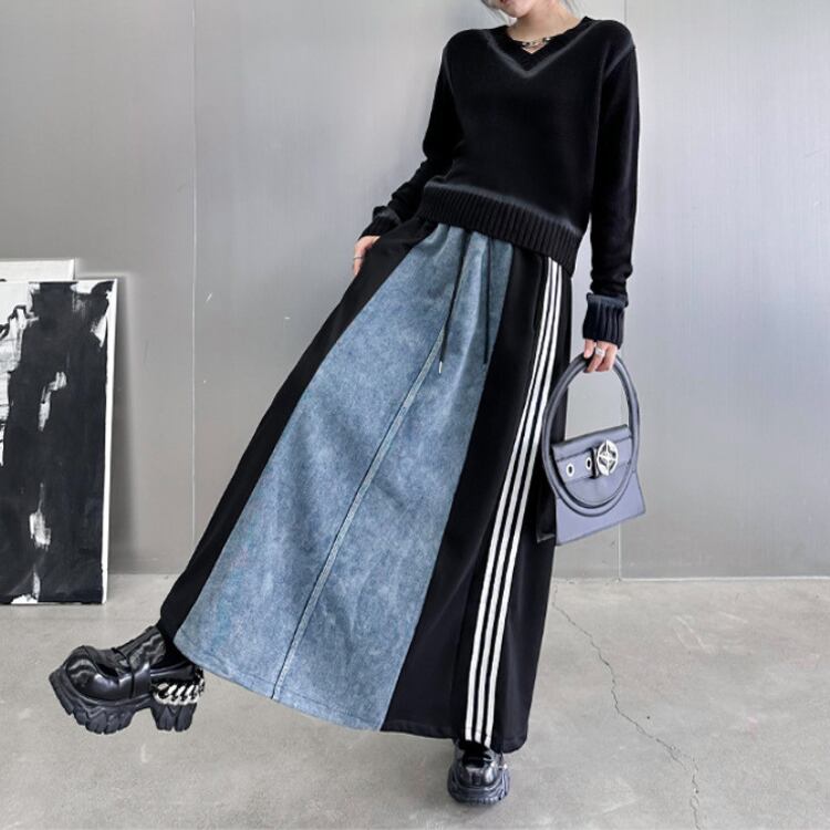 デニム×スポーツライン切替ロングスカート◆3col R30094
