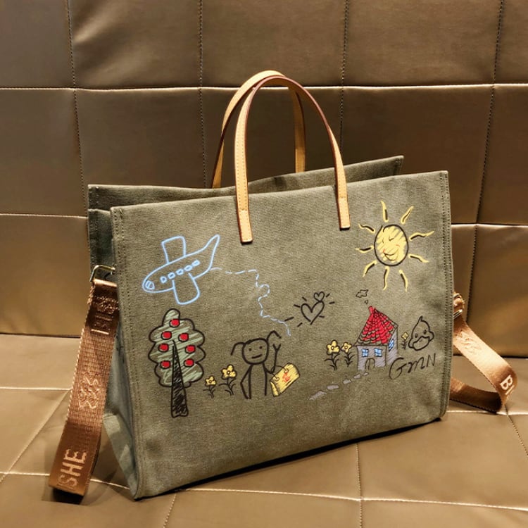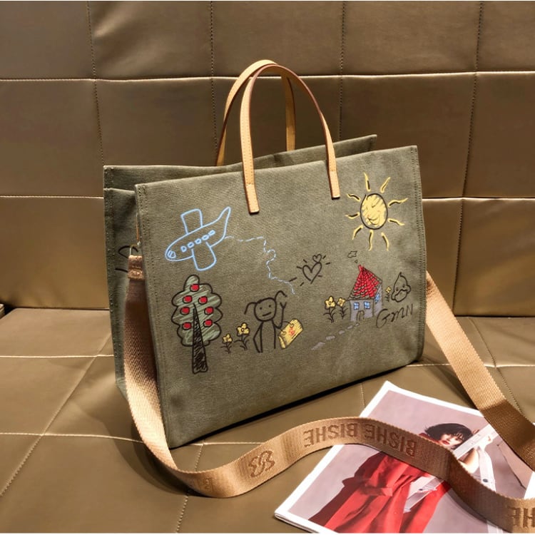 遊び心落書き風イラストプリントが印象的な大容量キャンバストートバッグで、手持ちとショルダーの2WAY仕様、通勤通学や旅行ショッピングまで幅広く活躍できるバッグです。