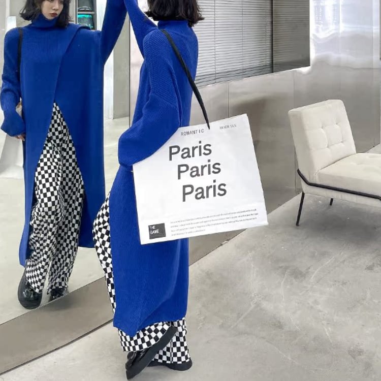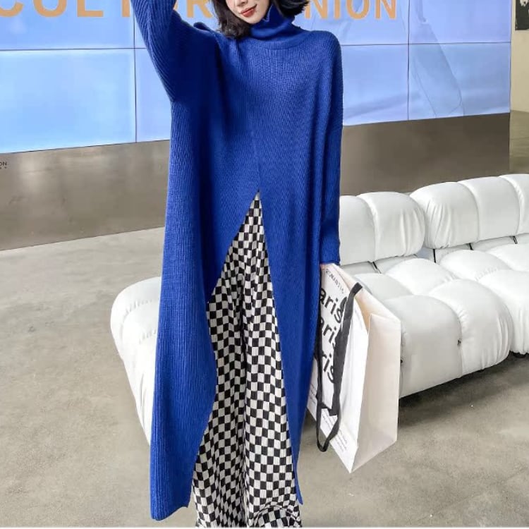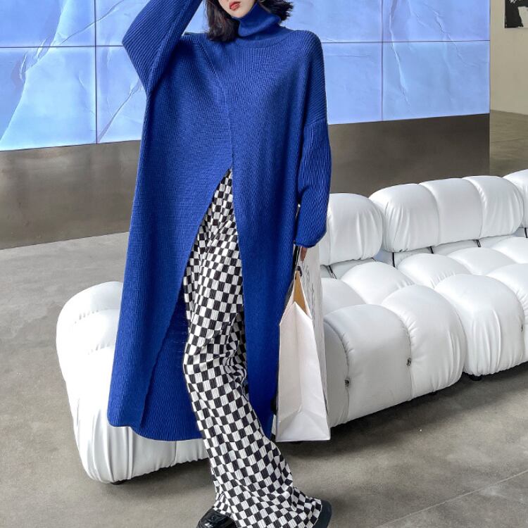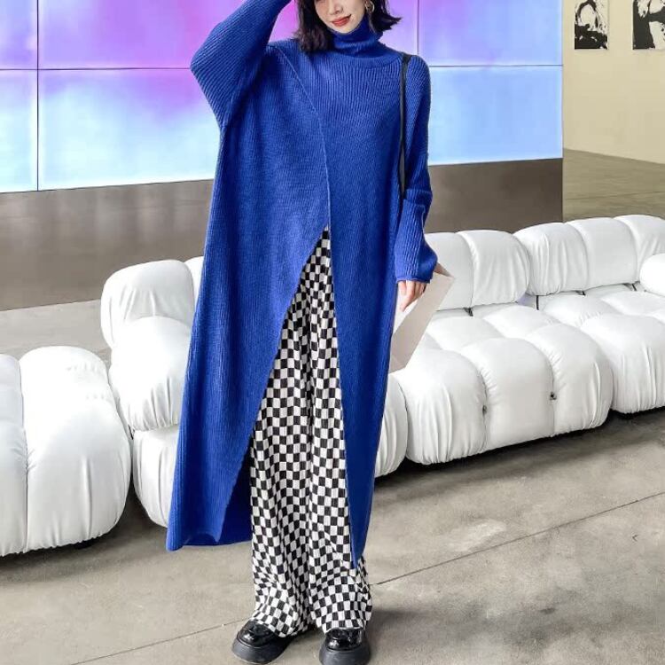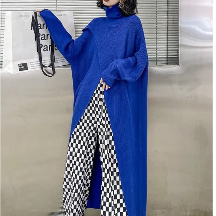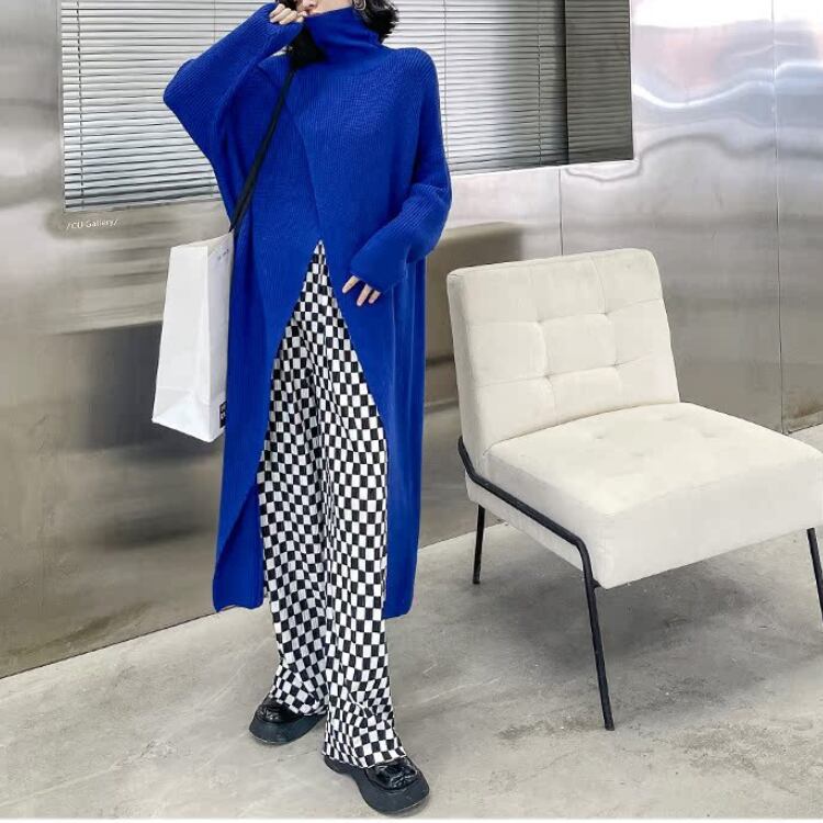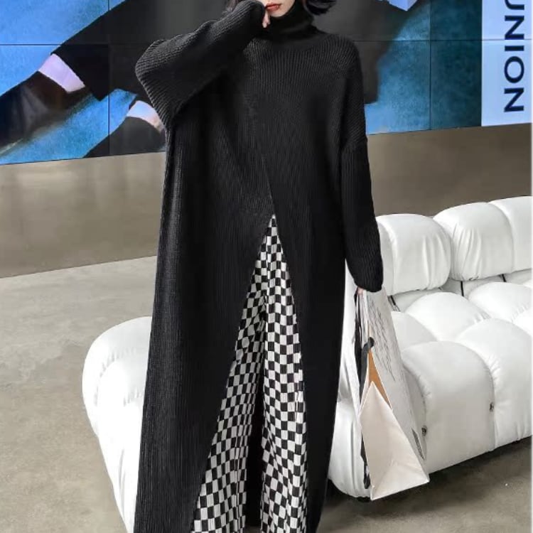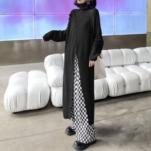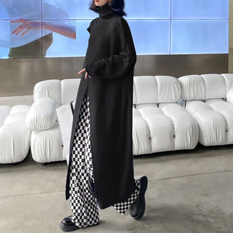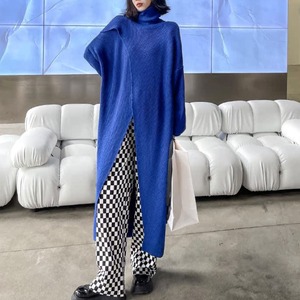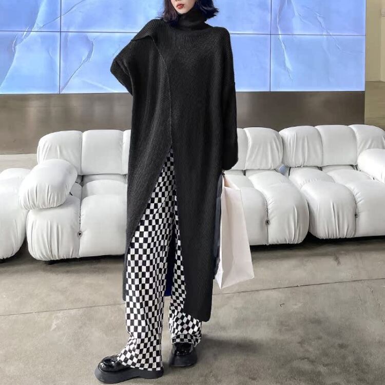 個性派デザインが魅力のハイネックニットワンピースは、ゆったりとしたシルエットとありながらのフロントスリットが抜け感を演出し、レイヤードスタイルを楽しめるモード感たっぷりの1枚です。