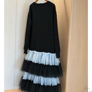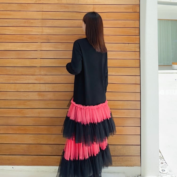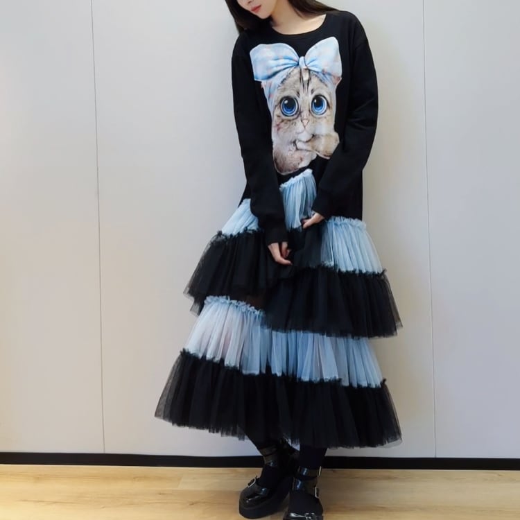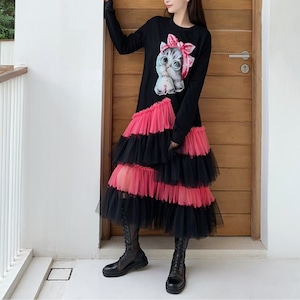 大きな猫プリント×チュール切替ロングワンピース◆2col R30104