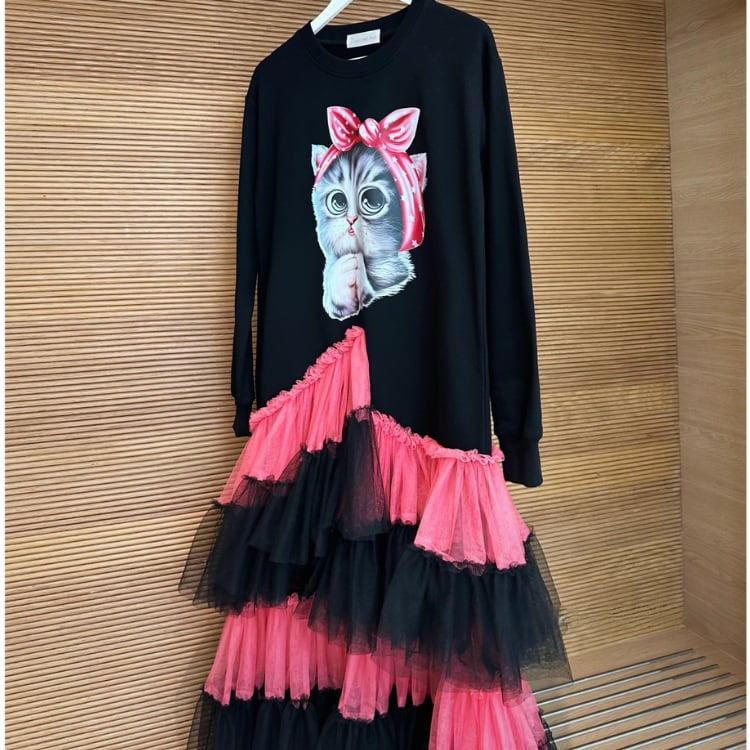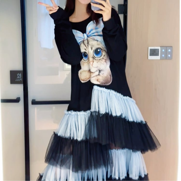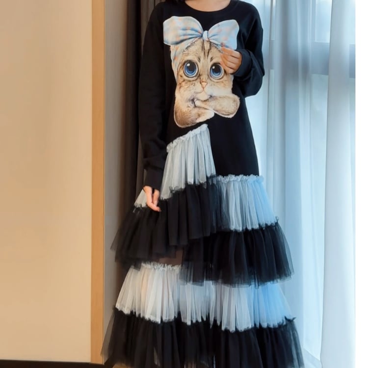 愛らしい大きな猫のプリントとふんわり広がるチュールスカート目が個性的で魅力的なデザインワンピースで、派ながらも女性らしいシルエットを演出する長袖ロング丈の一着です。