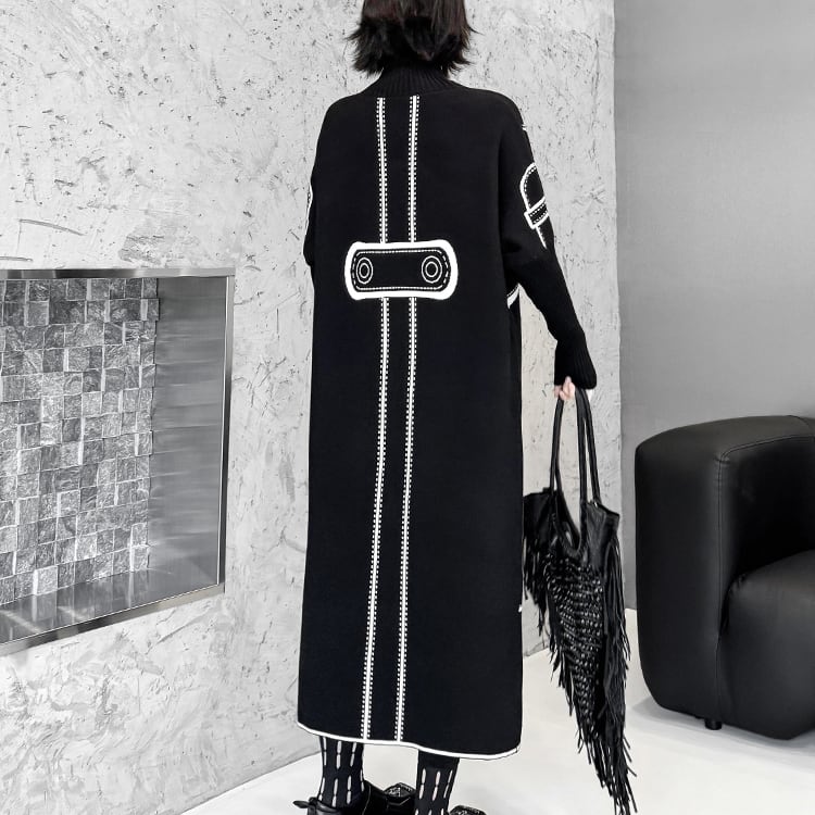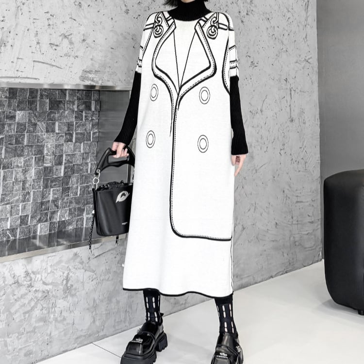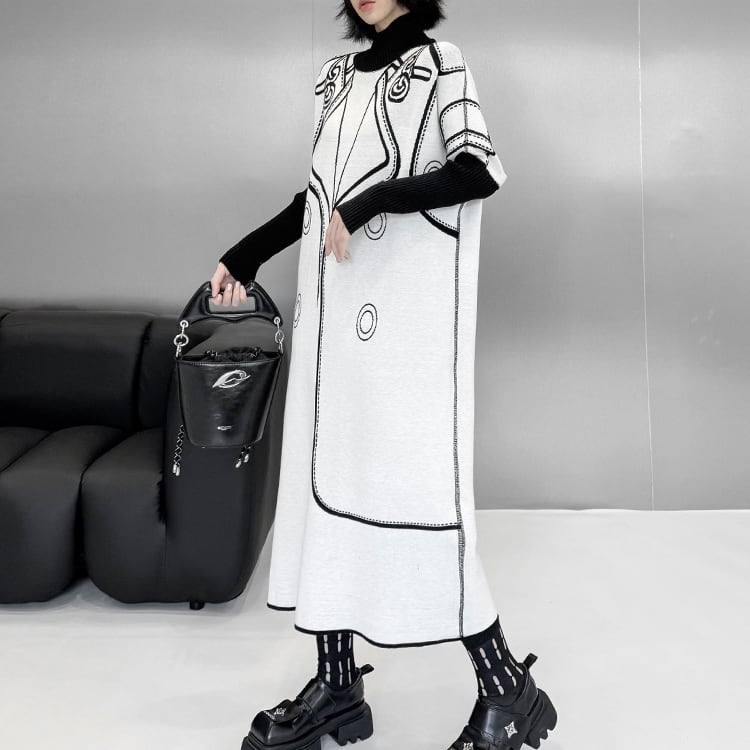 アートのような存在感を放つ、立体的なジャケットプリントが印象的なリバーシブルニットワンピース。表裏でモノトーンの配色を楽しめる2WAY仕様で、スタイリングの幅が広がる一枚。柔らかく伸縮性のあるニット素材が体に程よくフィットし、縦ラインを強調するデザインでスタイルアップ効果も抜群。上品さと遊び心を兼ね備えた小众デザインで、秋冬の主役になるアイテムです。