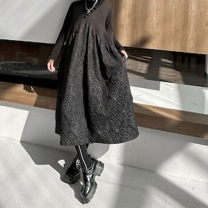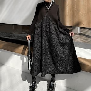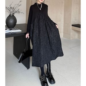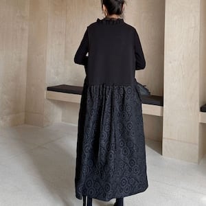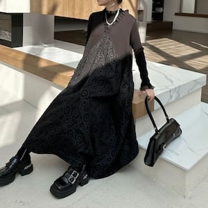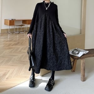 異素材切り替えが目を引く、ミモレ丈のAラインワンピースです。