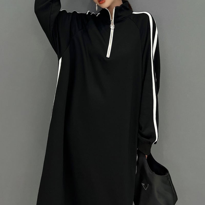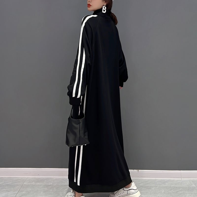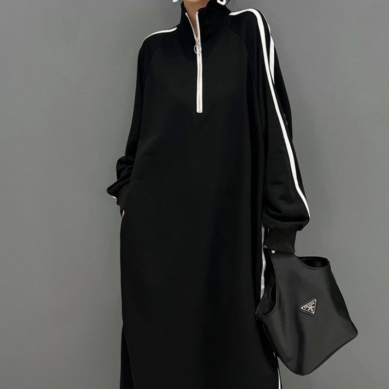 スポーティーな着こなしが叶う、ライン入りマキシ丈ワンピース。ハーフジップのデザインが、アクティブな印象を与えます。