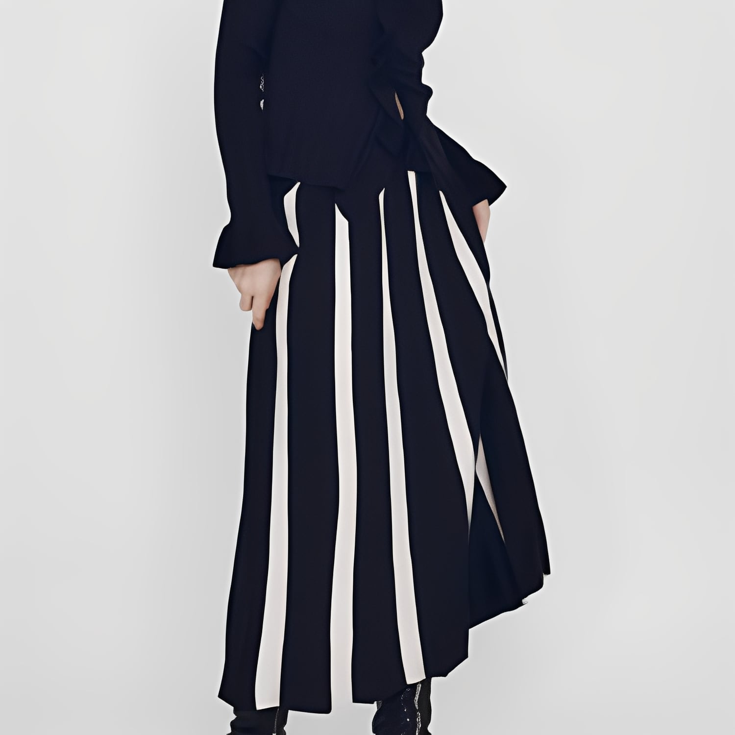 ストライプ柄が目を引く、ミモレ丈Aラインスカート。縦のラインがスタイルをすっきりと見せてくれます。程よいAラインシルエットで、カジュアルにもきれいめにも着こなせる汎用性の高さが魅力。普段使いはもちろん、ちょっとしたお出かけにもおすすめです。