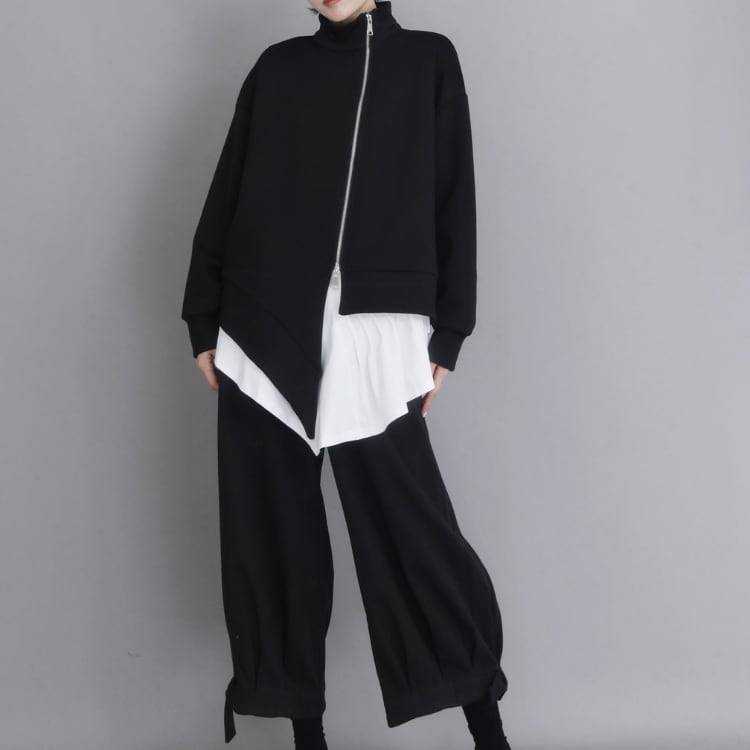 アシンメトリーなデザインが目を引く、ジップアップジャケットです。オーバーサイズでゆったりとしたシルエットなので、リラックスした着心地。ヒップ丈なので、体型カバー効果も期待できます。普段使いはもちろん、少し個性を出したいお出かけにもおすすめです。