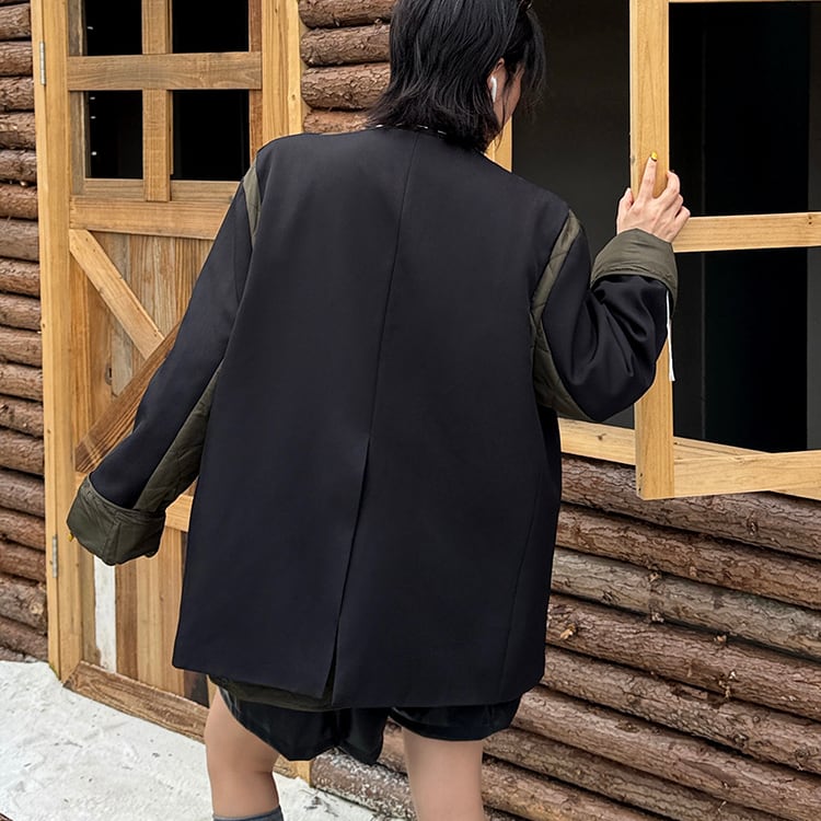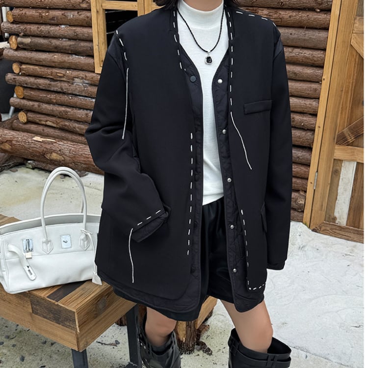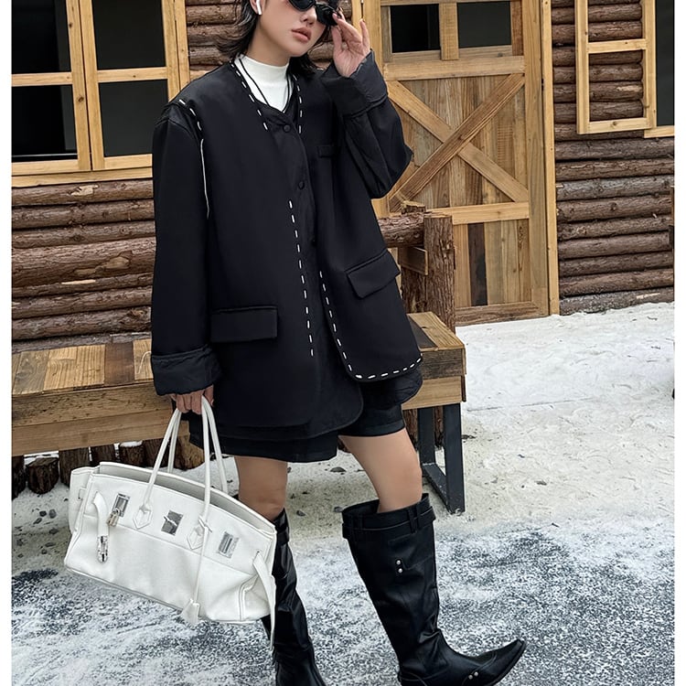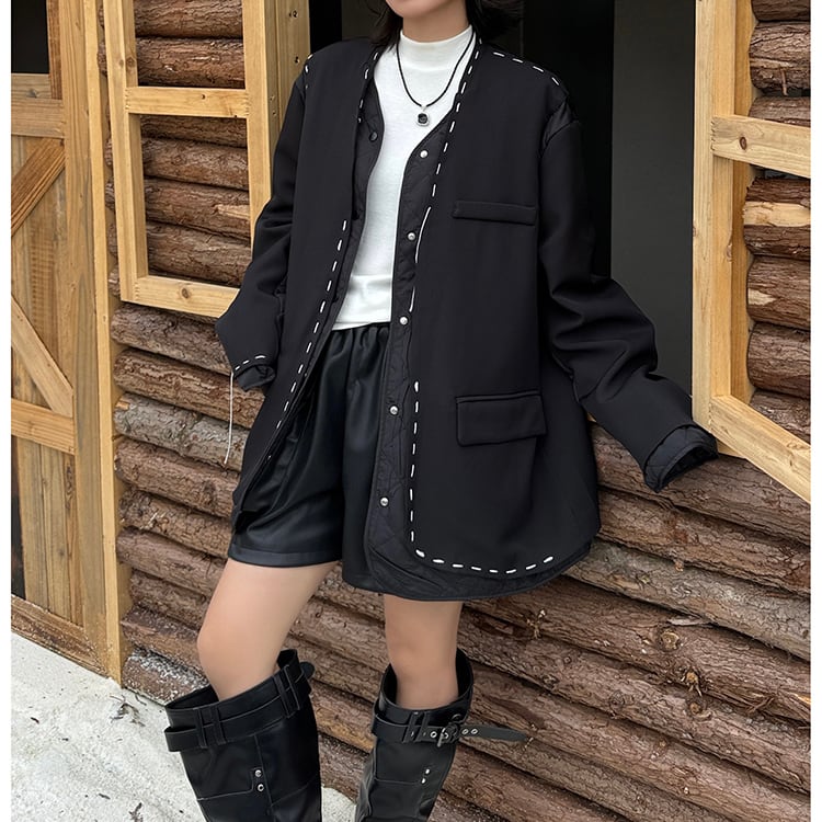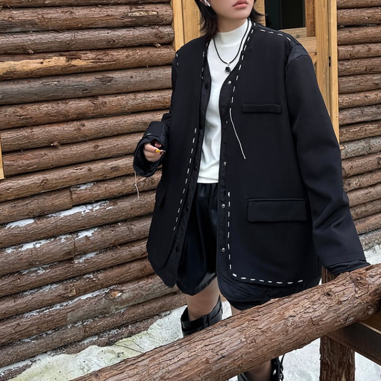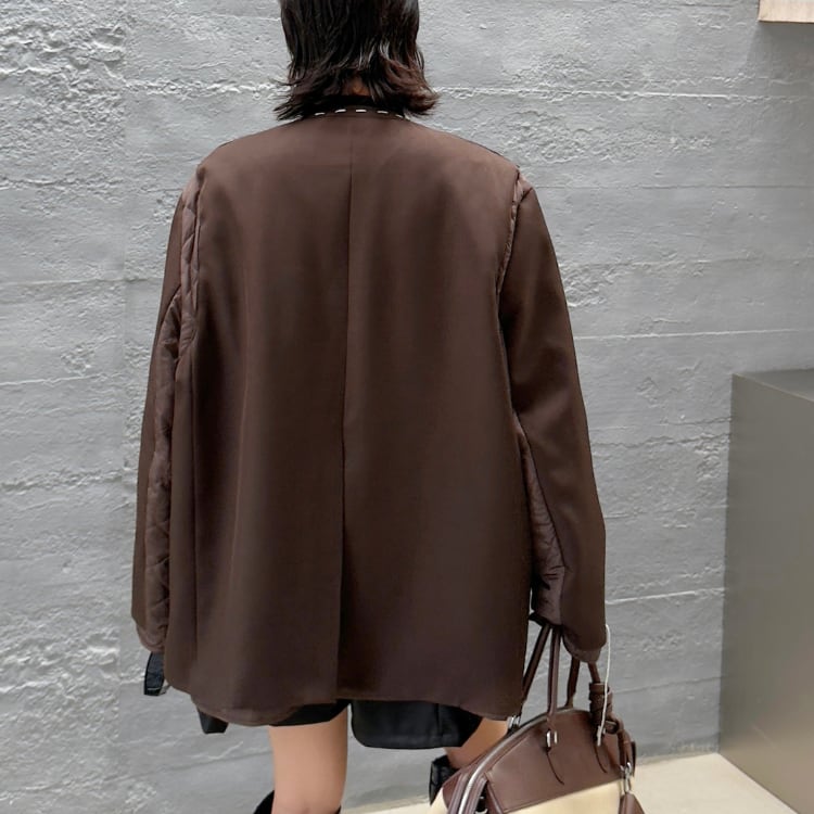 ステッチがアクセントになった、オーバーサイズのヒップ丈ジャケットです。ゆったりとしたシルエットで、リラックスした着心地。両サイドにはパッチポケットが付いており、デザイン性と機能性を兼ね備えています。カジュアルな普段使いはもちろん、オフィスシーンにもおすすめです。