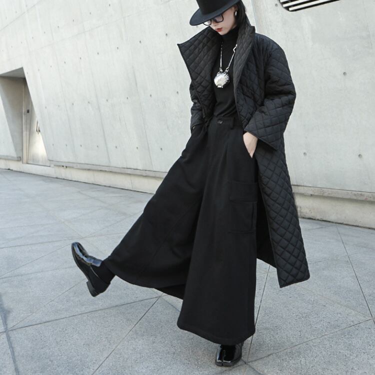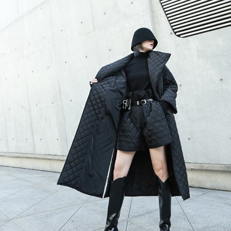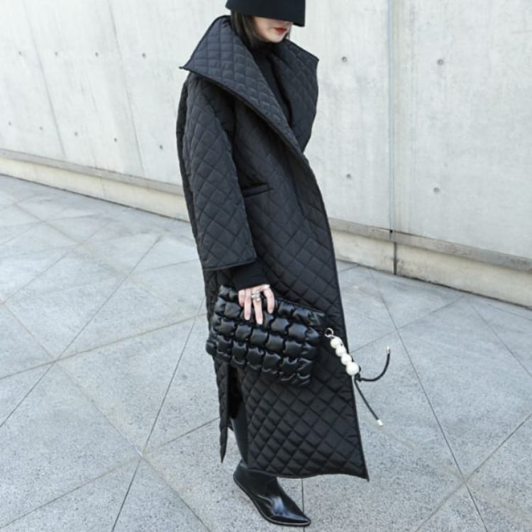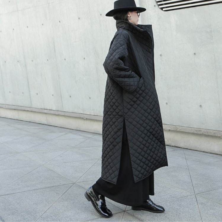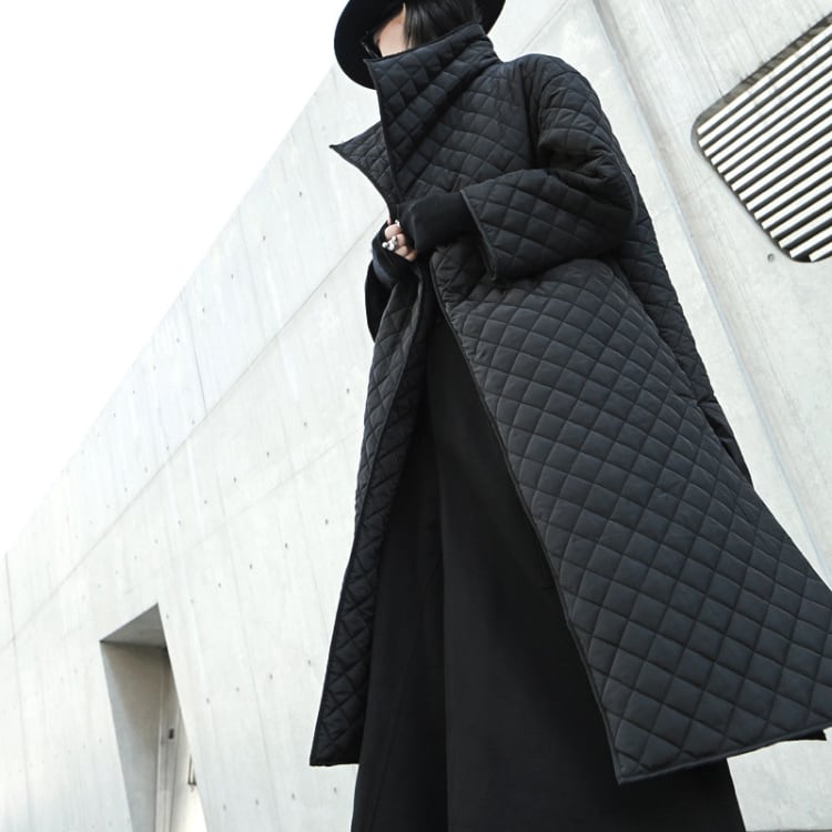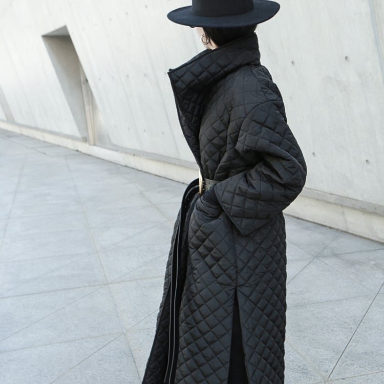 キルティングデザインが目を引く、マキシ丈ロングコート。