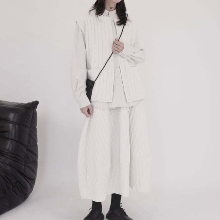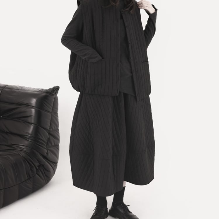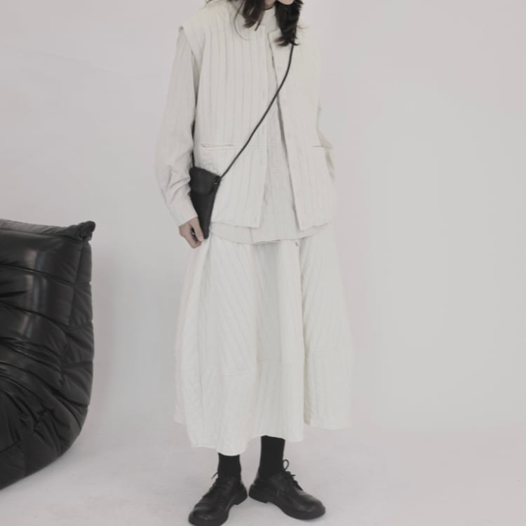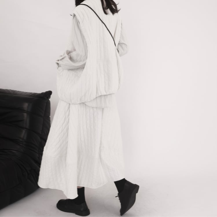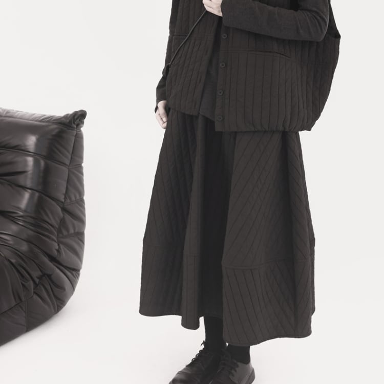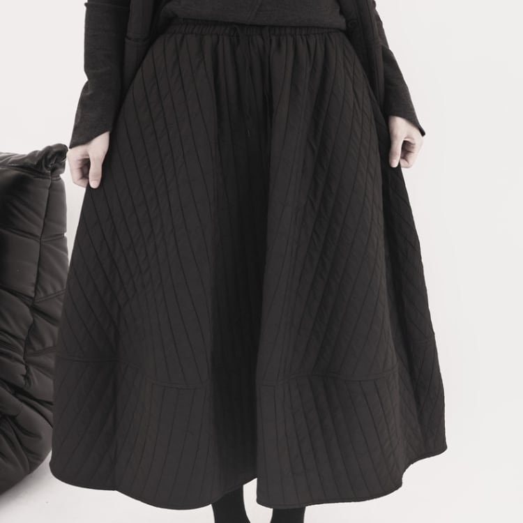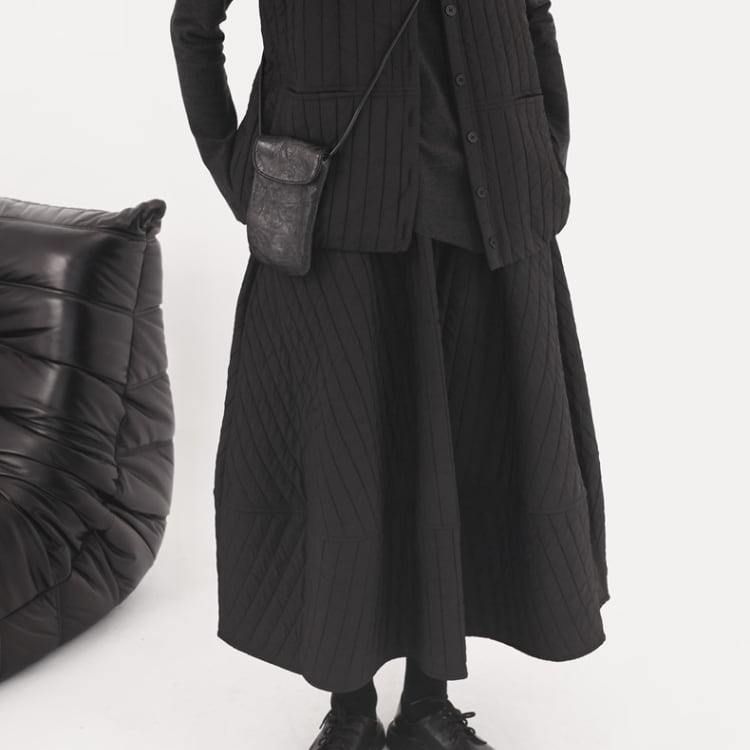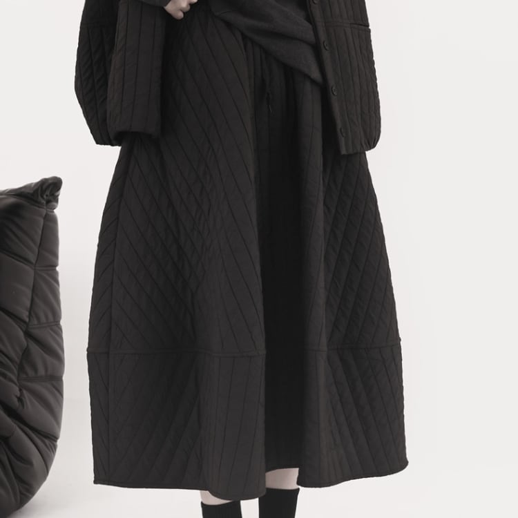 キルティング加工が施されたミモレ丈のAラインスカートです。