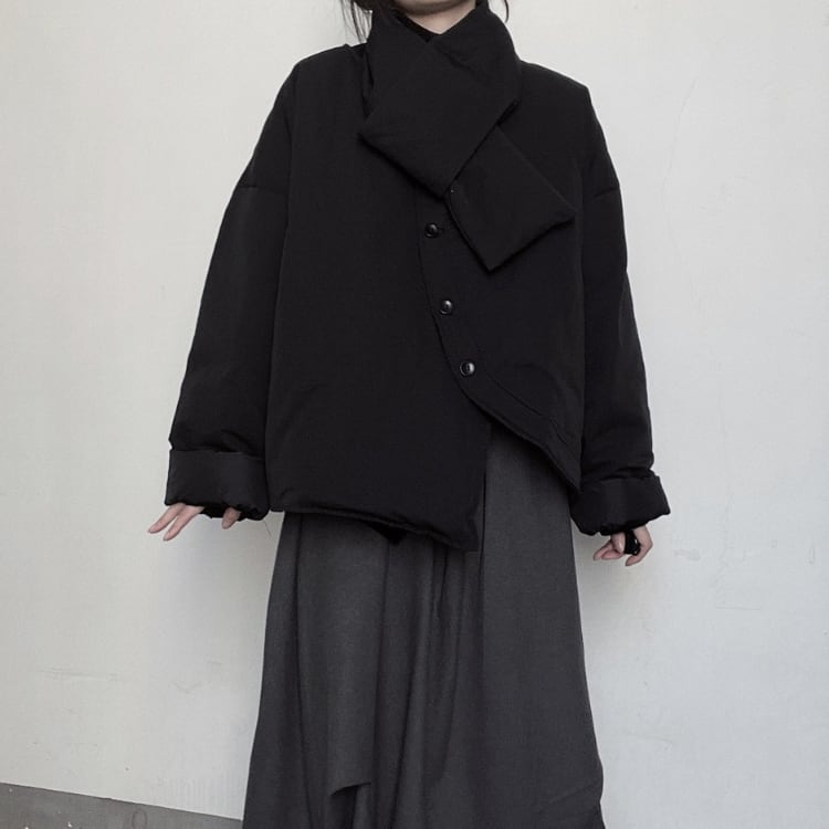 アシンメトリーなデザインが目を引く、ショート丈ジャケット。