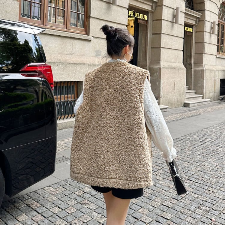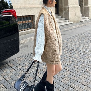 ふんわりとしたボア素材が季節感を引き立てるロングベスト。