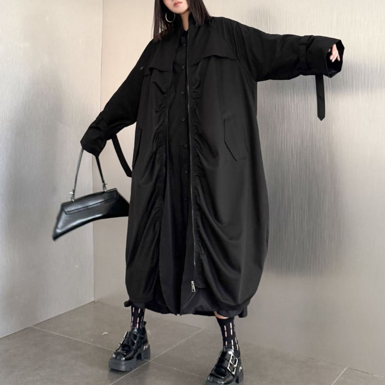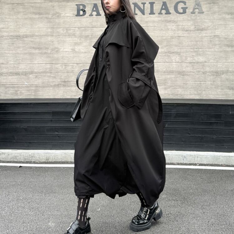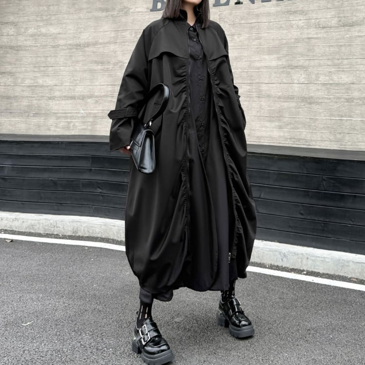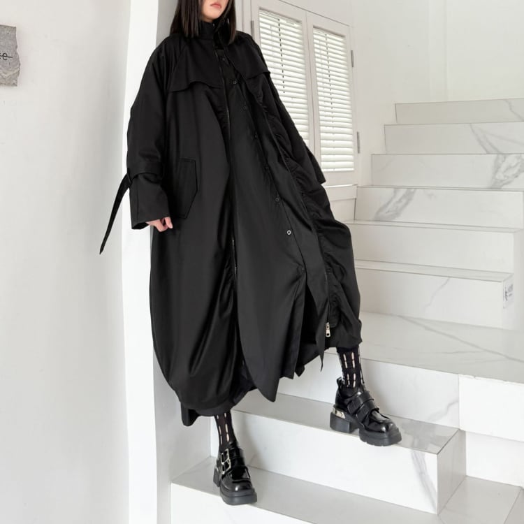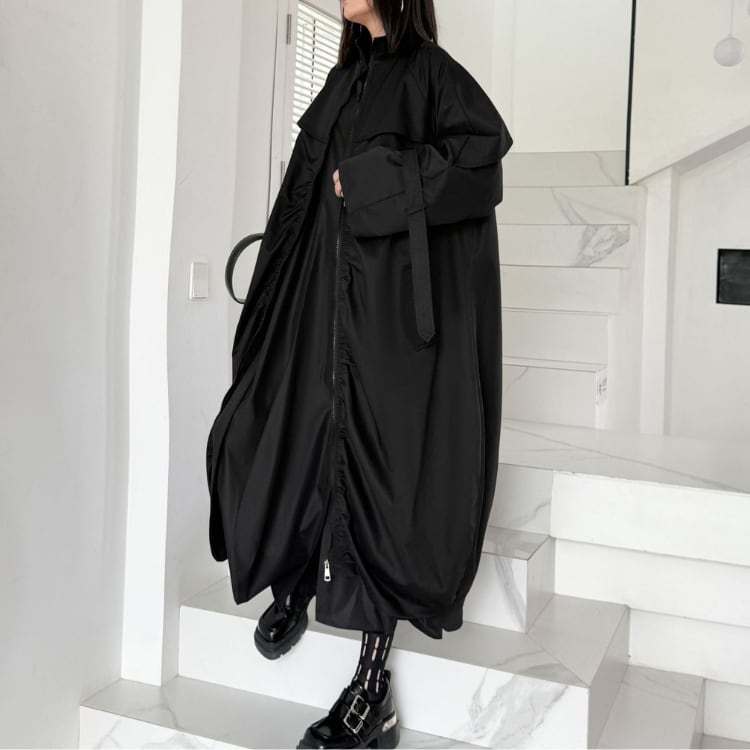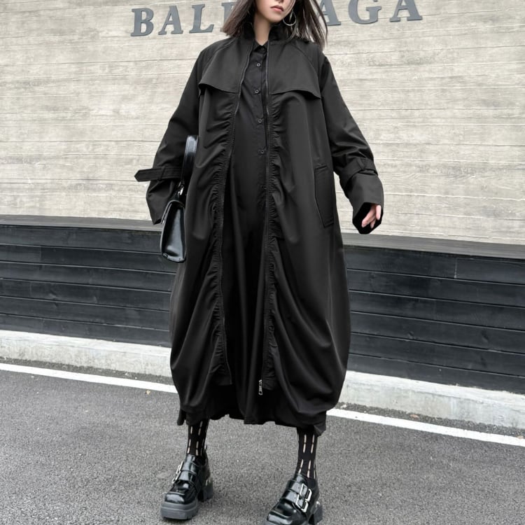 立体的なドレープシルエットが印象的なオーバーサイズコート。