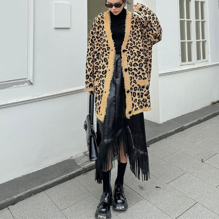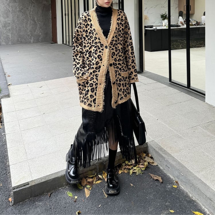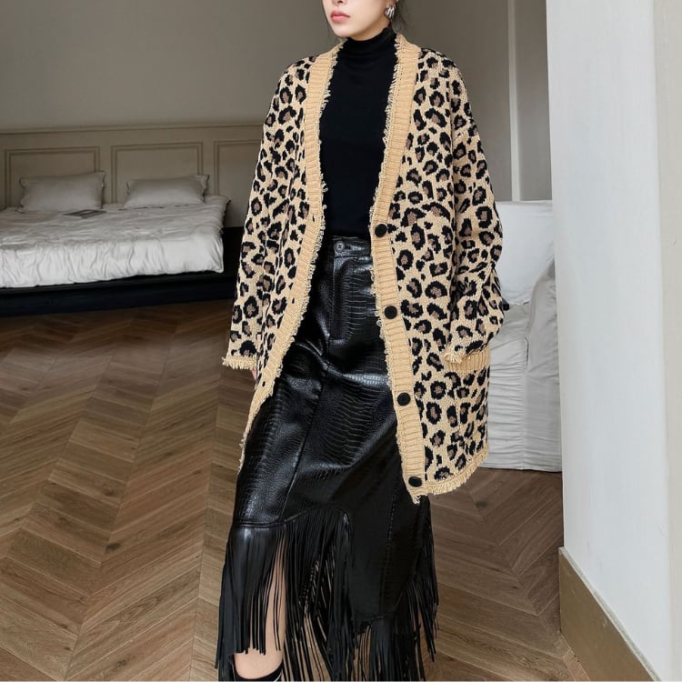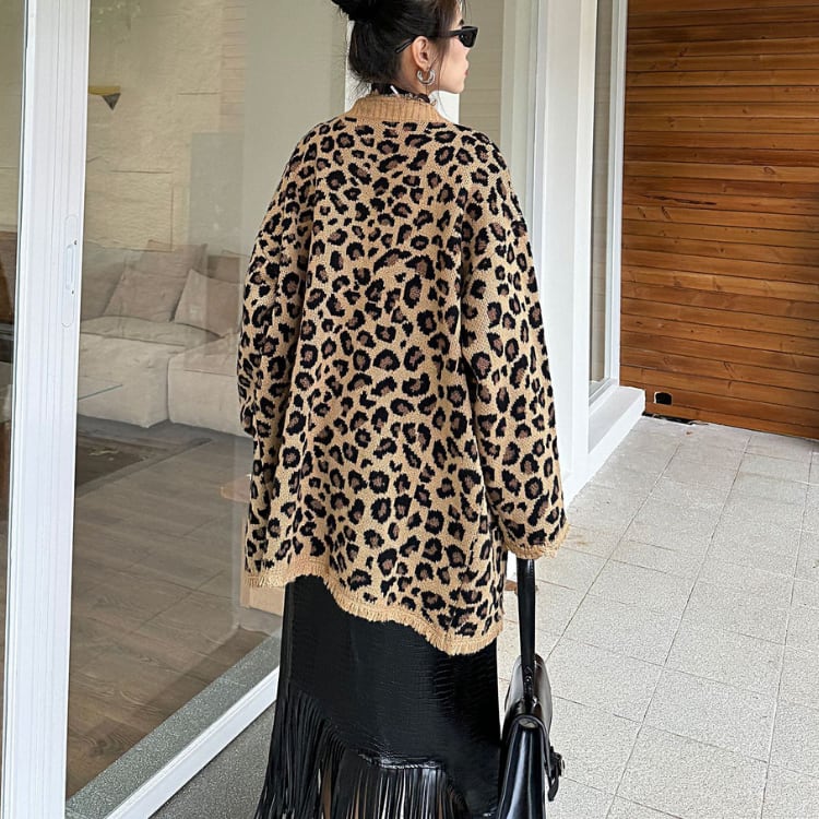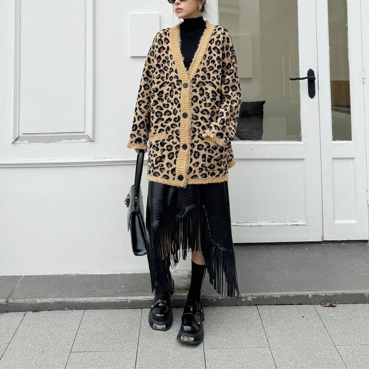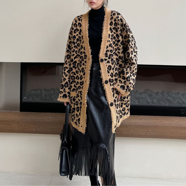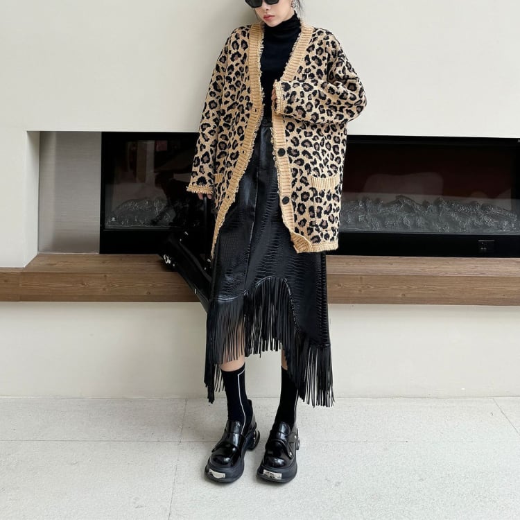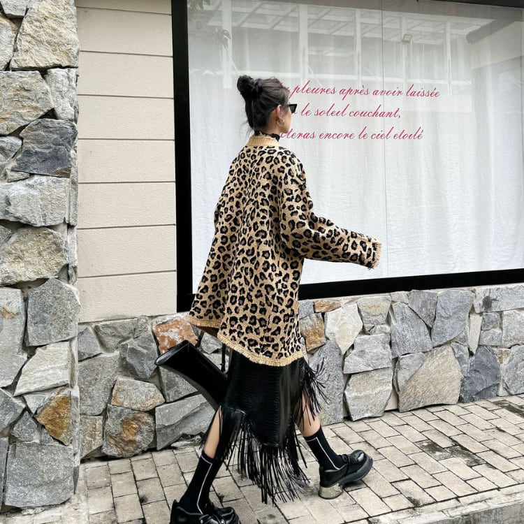 クラシカルなレオパード柄にフリンジラインをあしらったデザインカーディガン。存在感のある柄ながらも落ち着いたベージュトーンで、大人のモード感を演出します。ゆったりとしたシルエットで抜け感があり、タートルやワンピースとのレイヤードにも最適。厚みのある柔らかいニット素材で防寒性も抜群。羽織るだけでスタイルが決まる、秋冬の主役アウター。