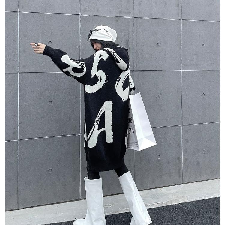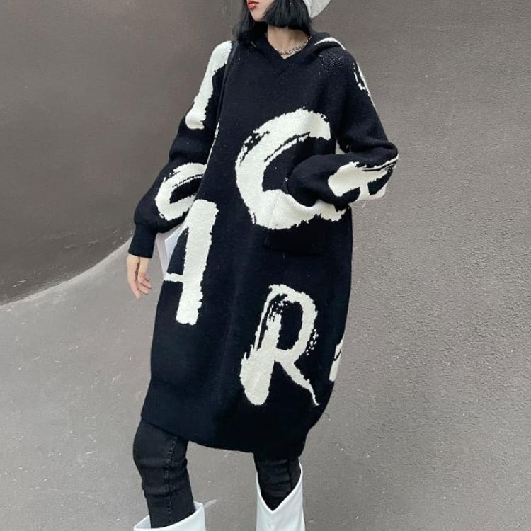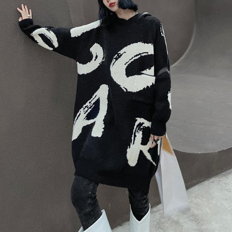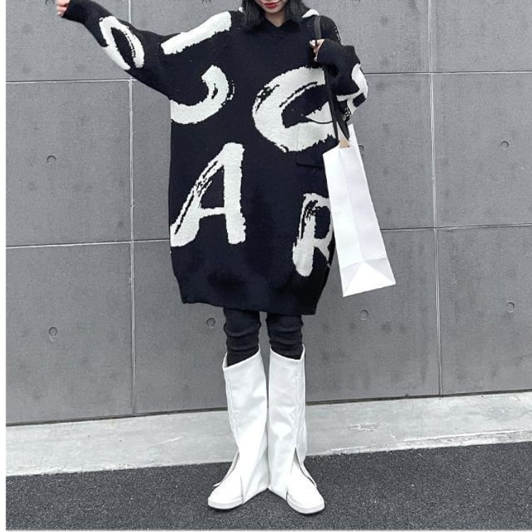 大胆な筆記体ロゴが目を引くオーバーサイズニットワンピース。