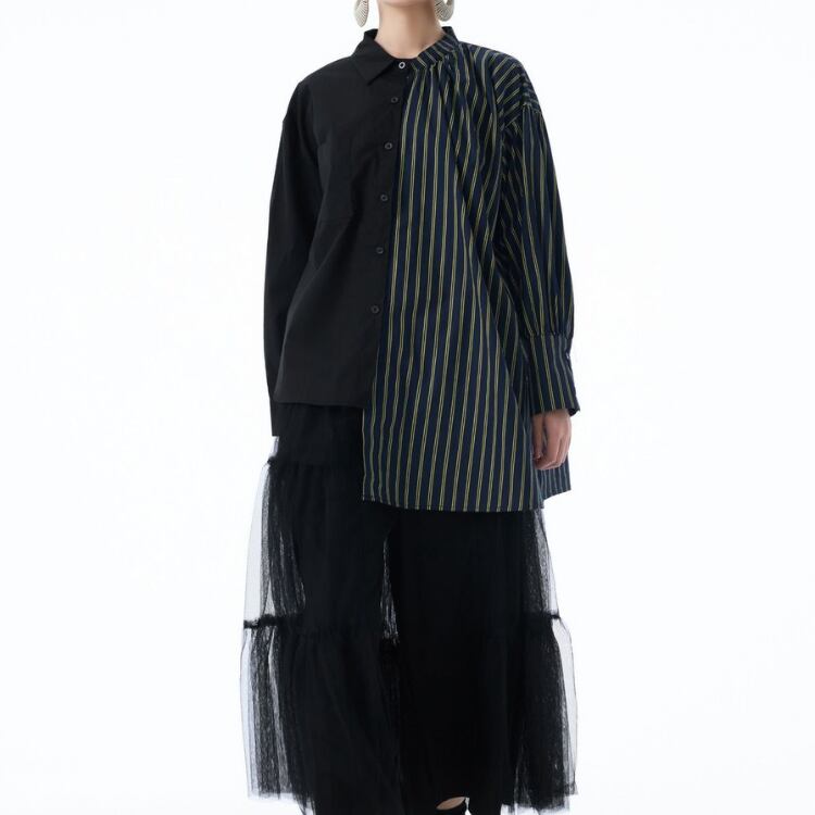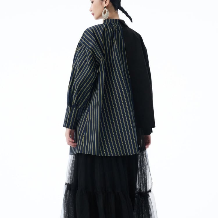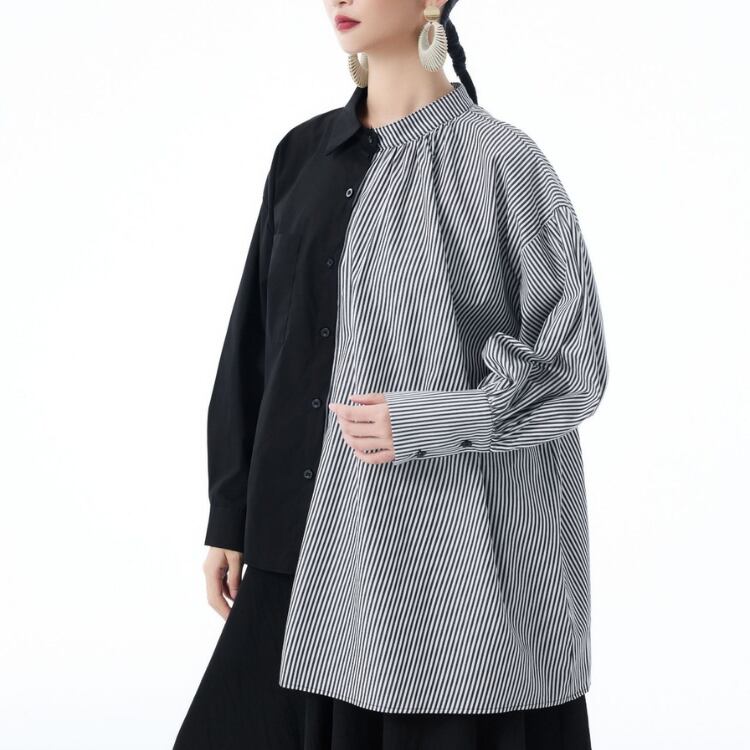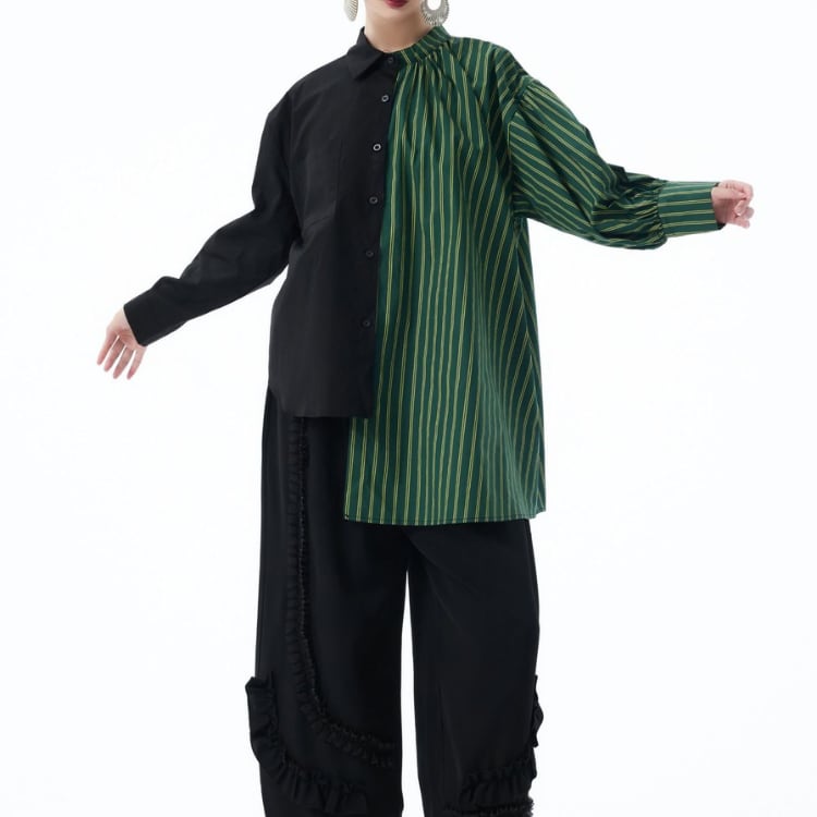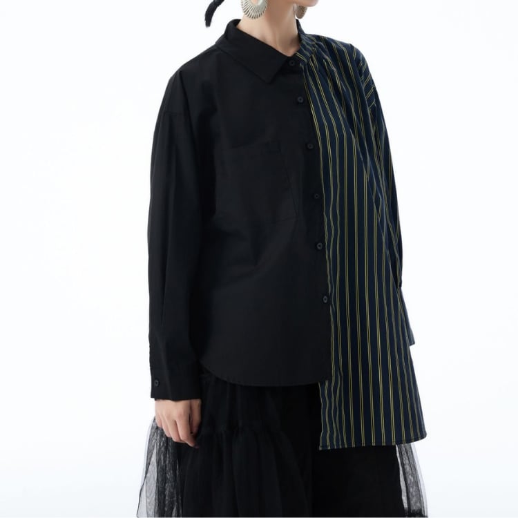 左右で異なる素材と柄を組み合わせた、個性あふれる切り替えデザインシャツ。
