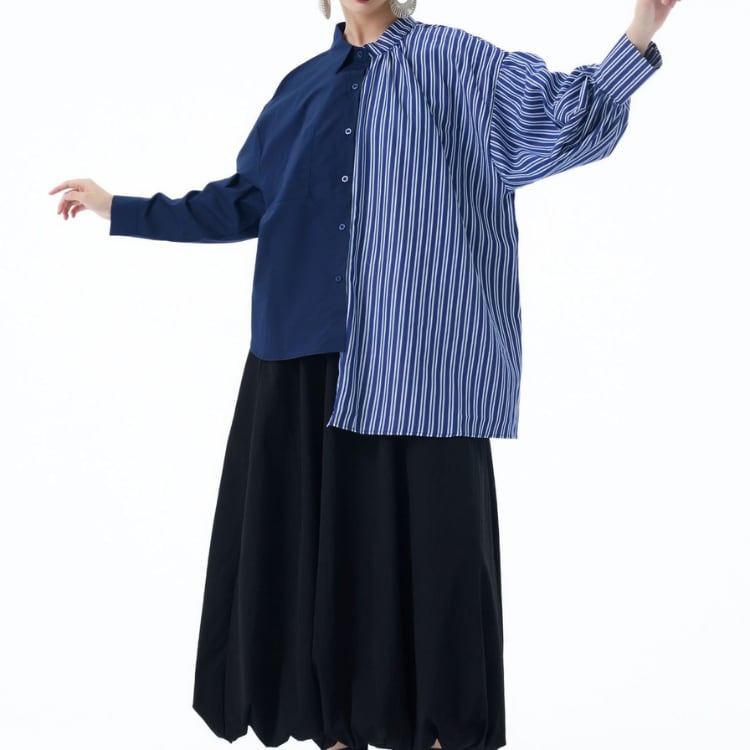 無地×ストライプのコントラストがモード感を演出し、ギャザーを寄せた立体的なシルエットでこなれ感も◎。
