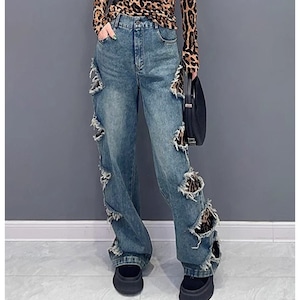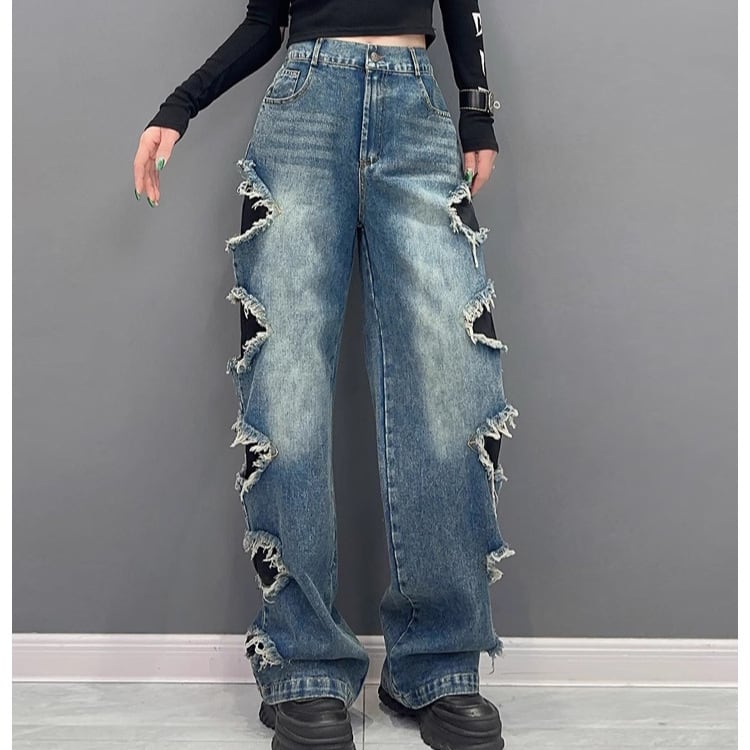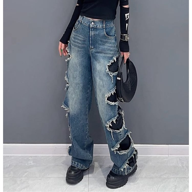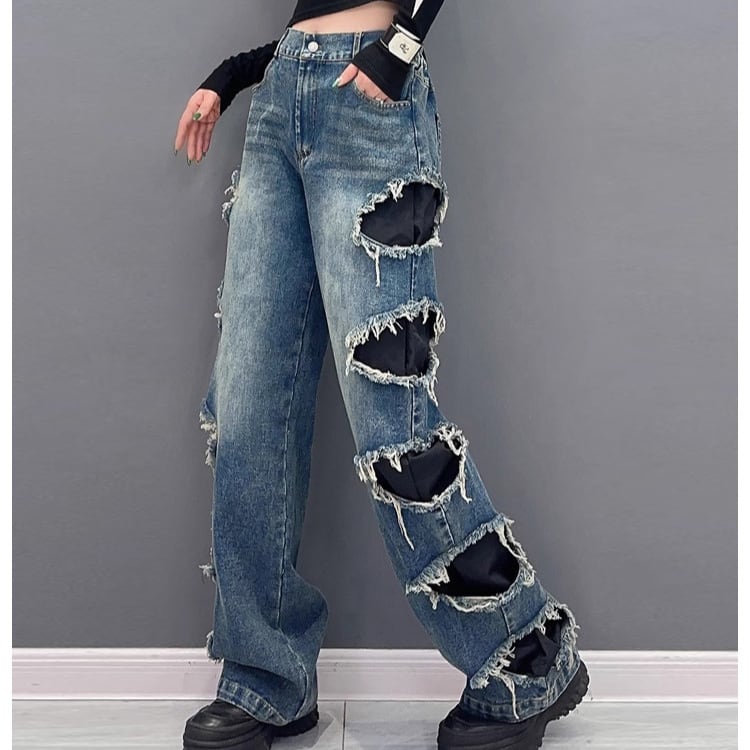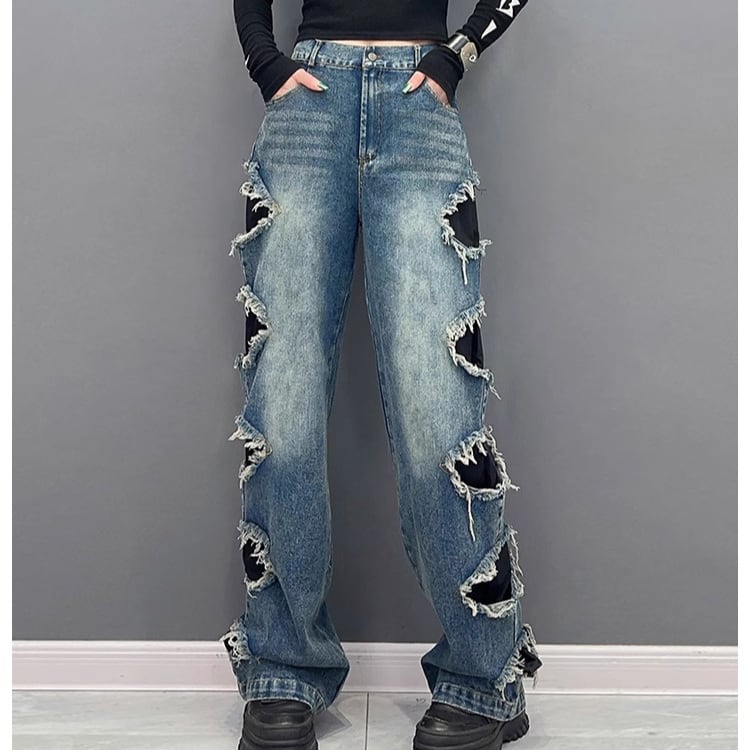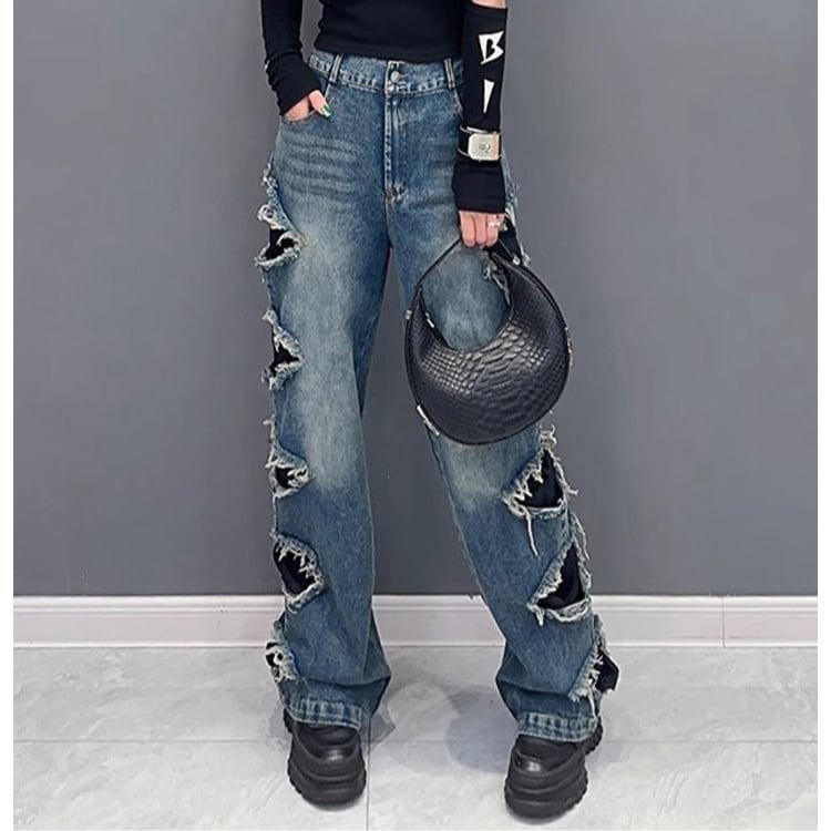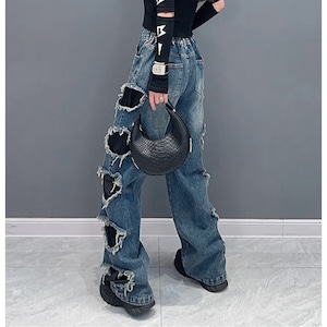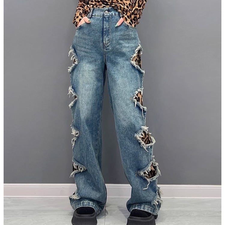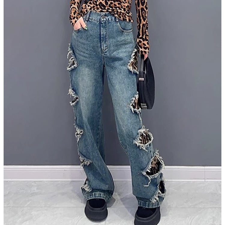 大胆なクラッシュデザインにレオパード柄やブラック生地をレイヤードした個性派デニムパンツ。