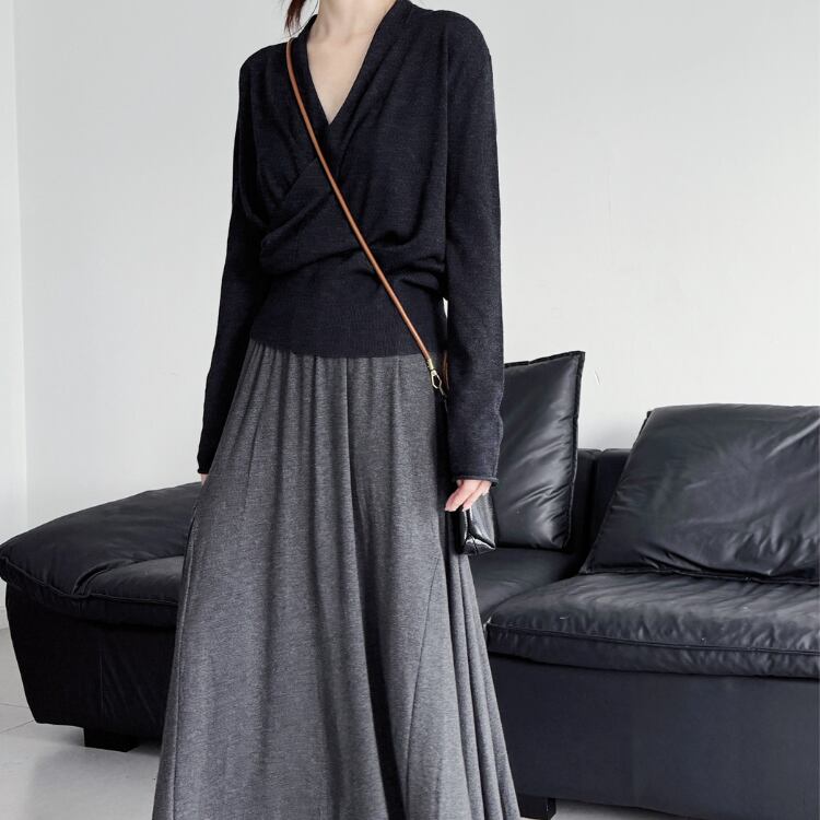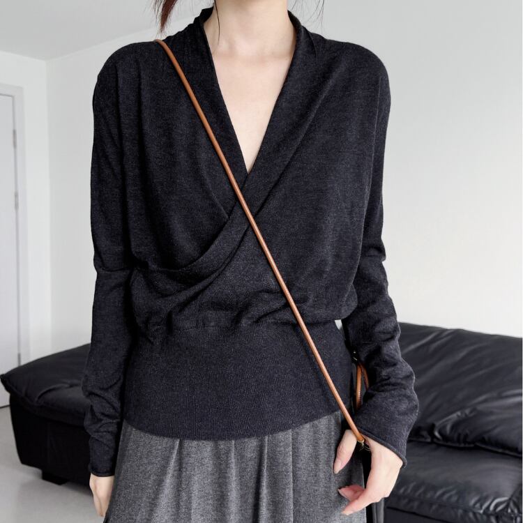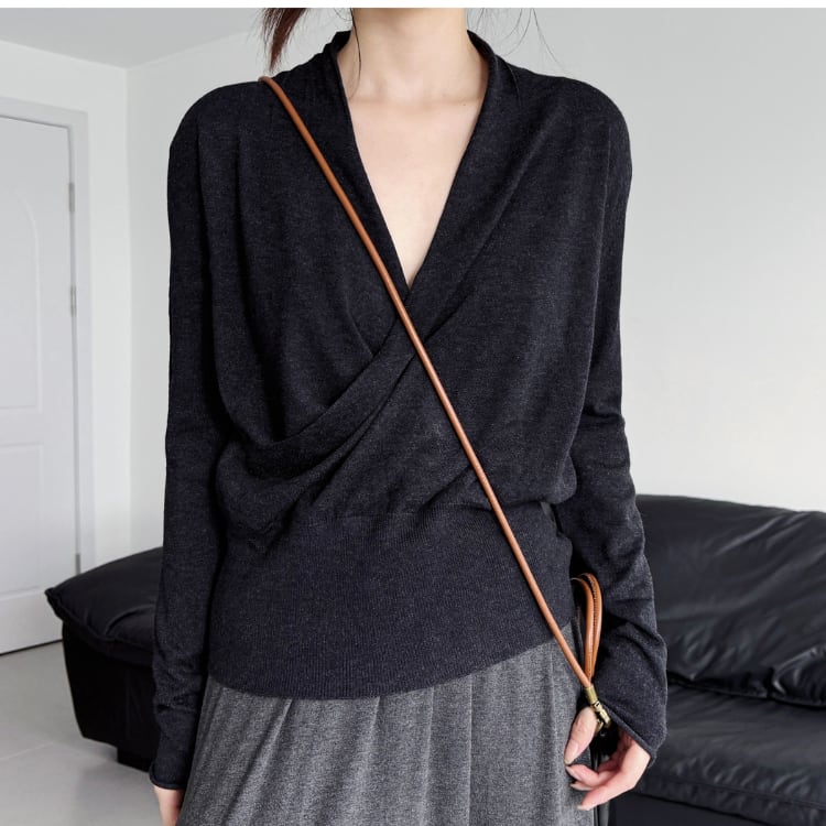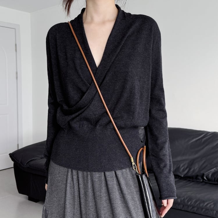 カシュクール風のフロントデザインが特徴的なニットプルオーバー。