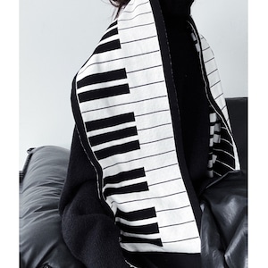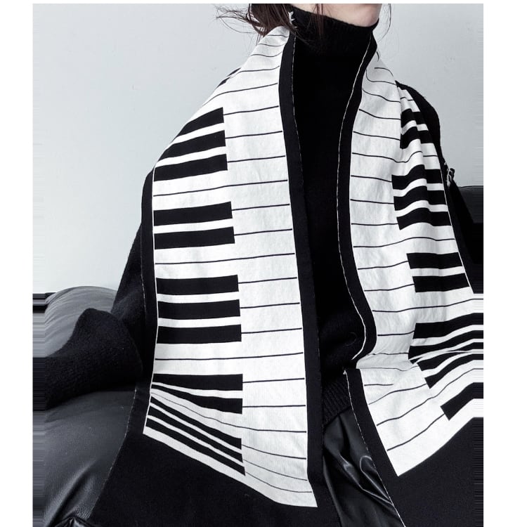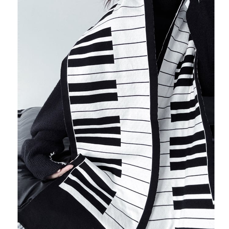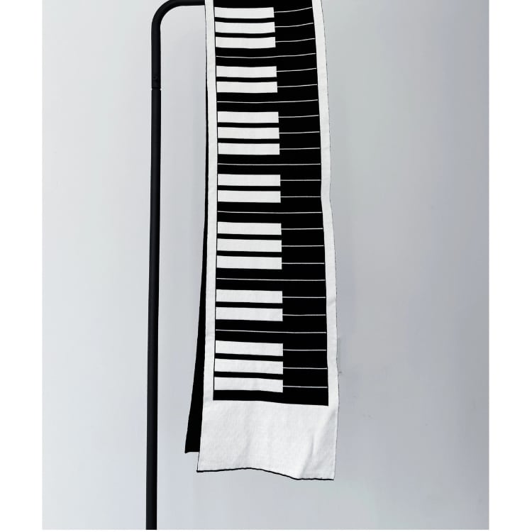 ピアノの鍵盤をモチーフにしたグラフィカルなジャガードニットマフラー。
