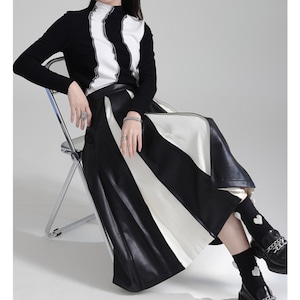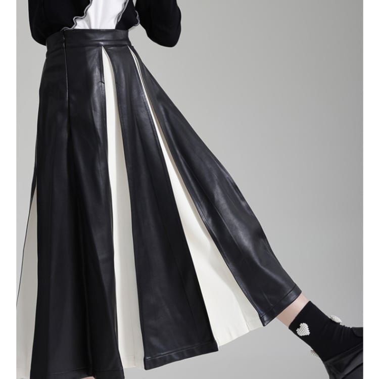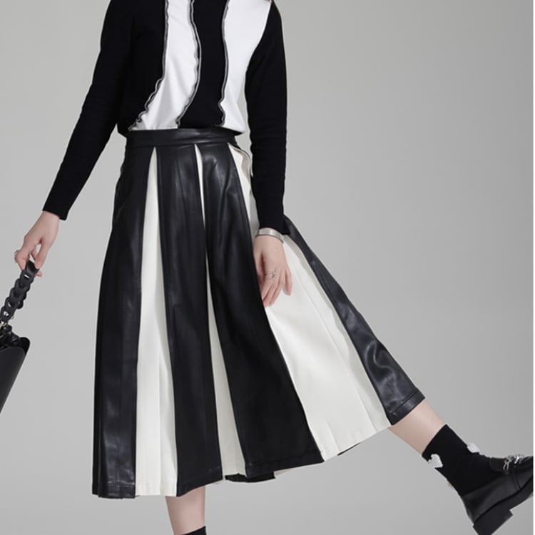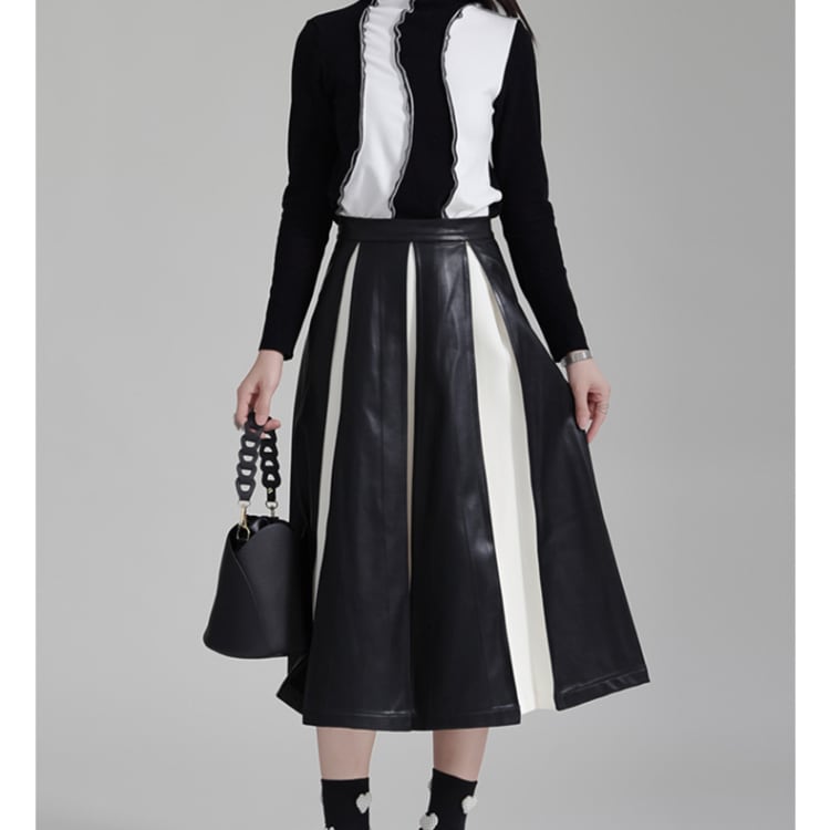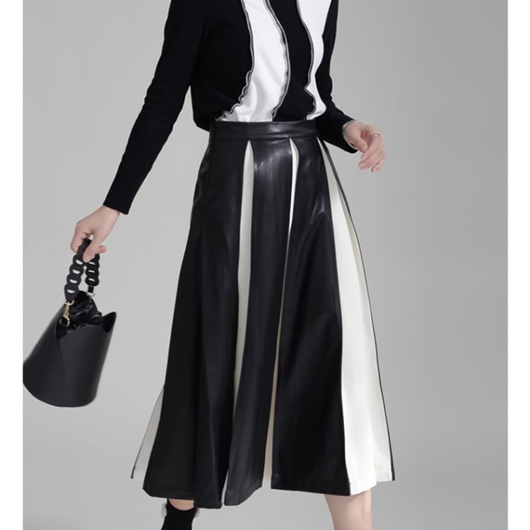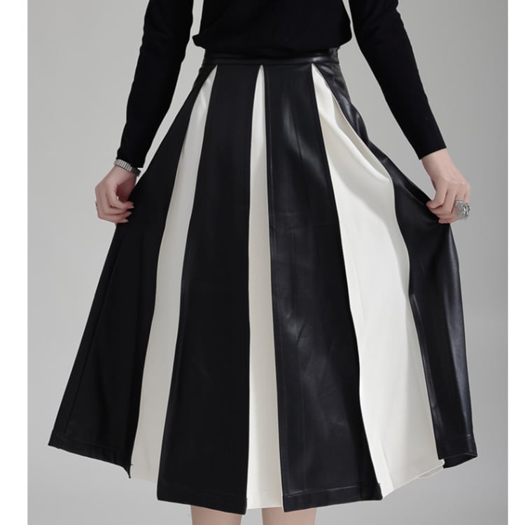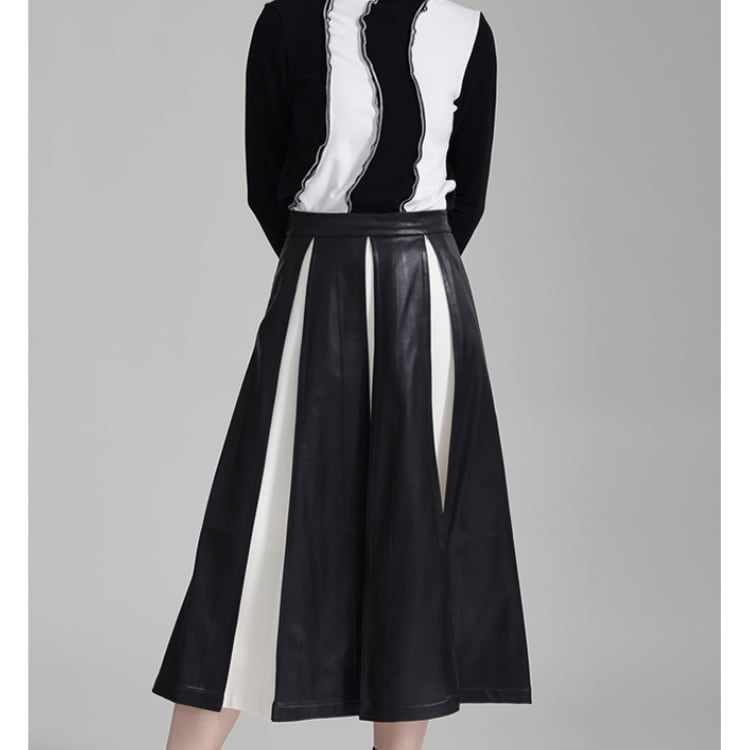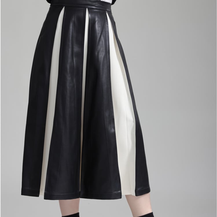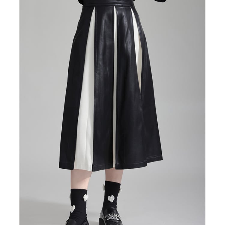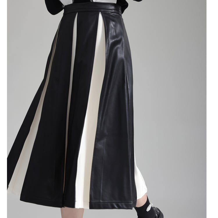 フェイクレザーと布地の異素材プリーツが絶妙なコントラストを生み出すミディ丈スカート。