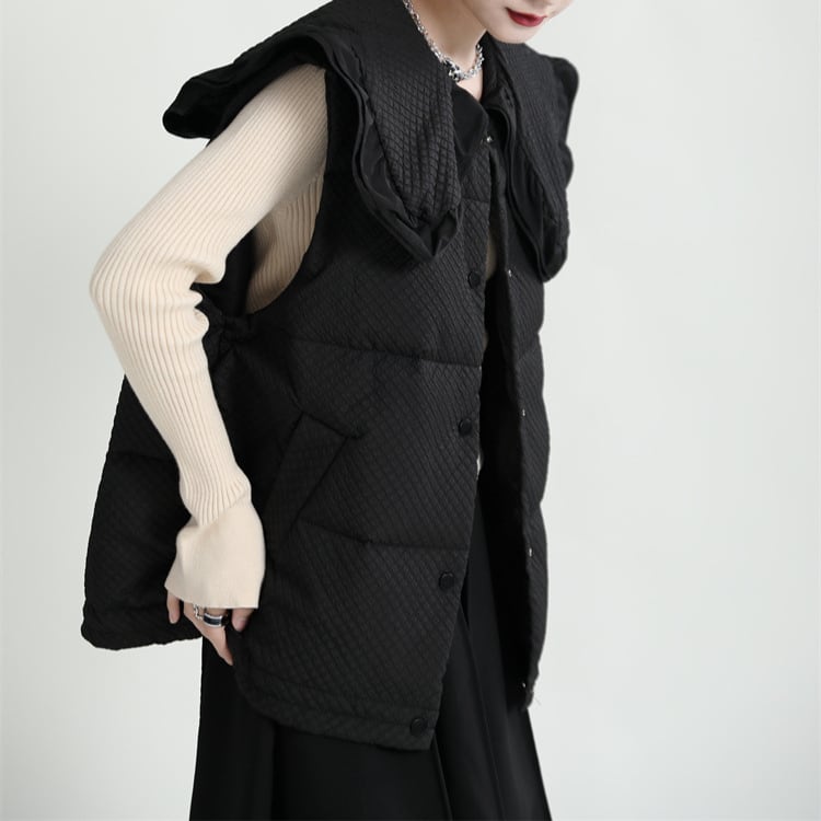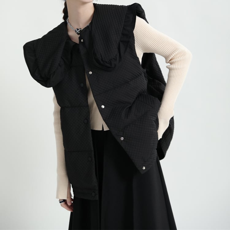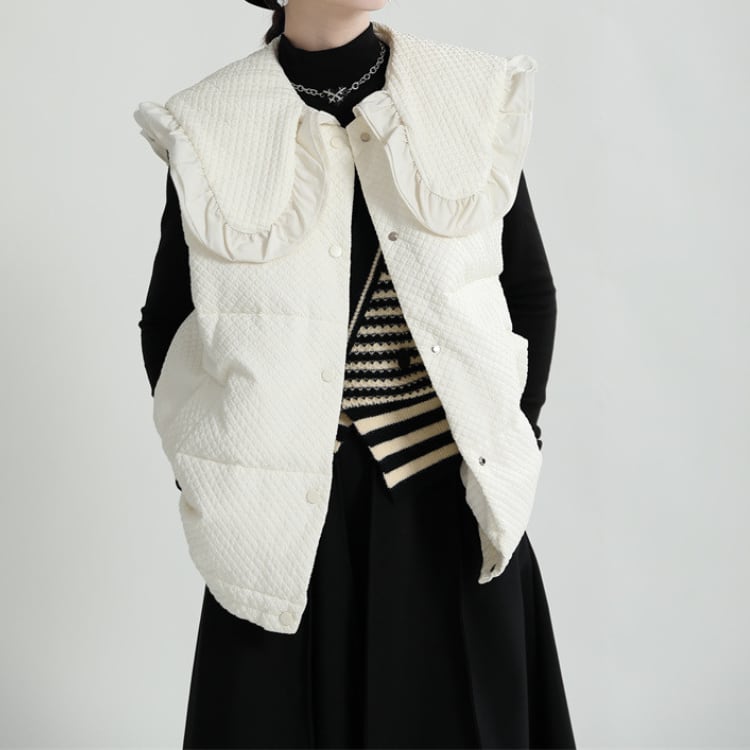 立体感のあるフリル付きビッグカラーがポイントの中綿ベスト。