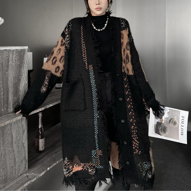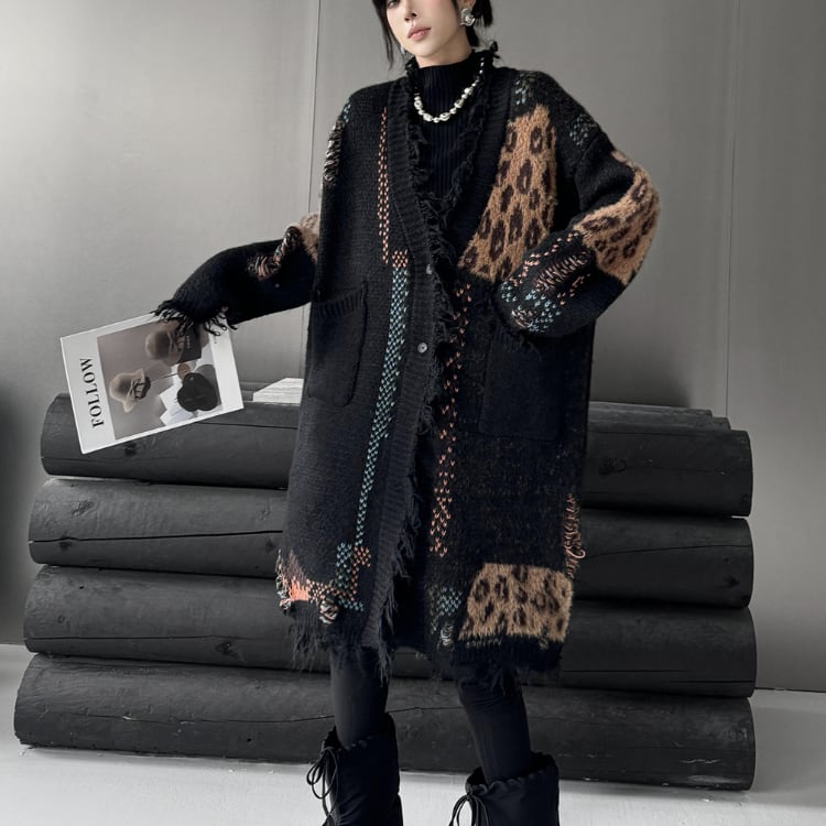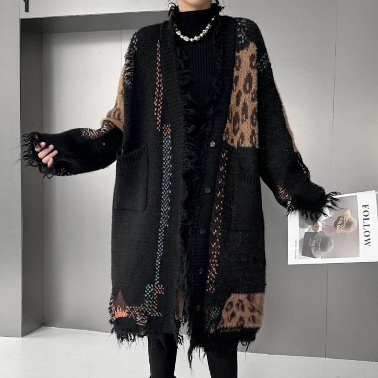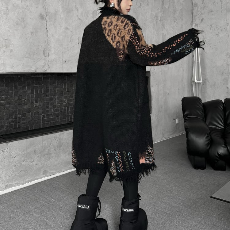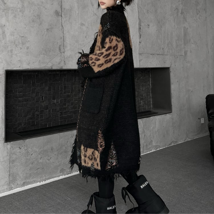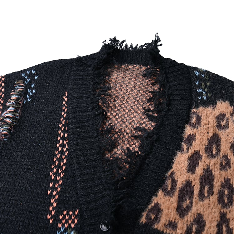 異素材風の編み地とレオパード柄をミックスした、デザイン性の高いニットカーディガン。