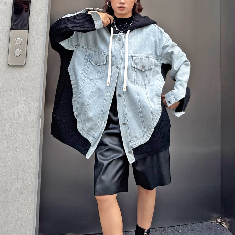 デニムとニットをドッキングしたフード付きジャケット。
