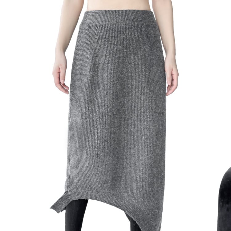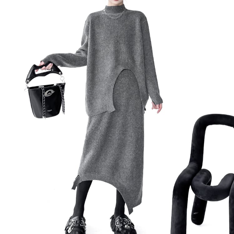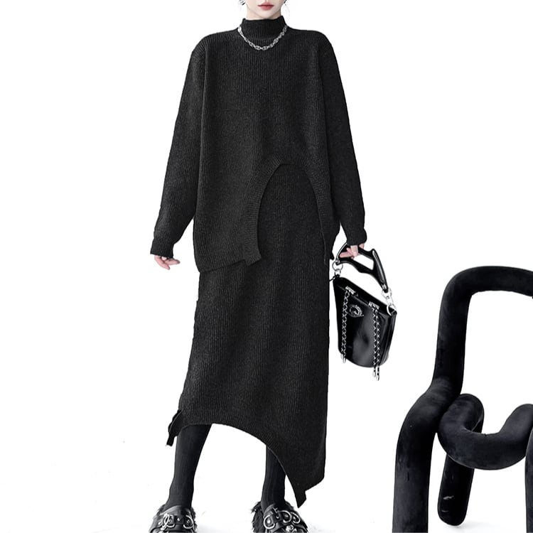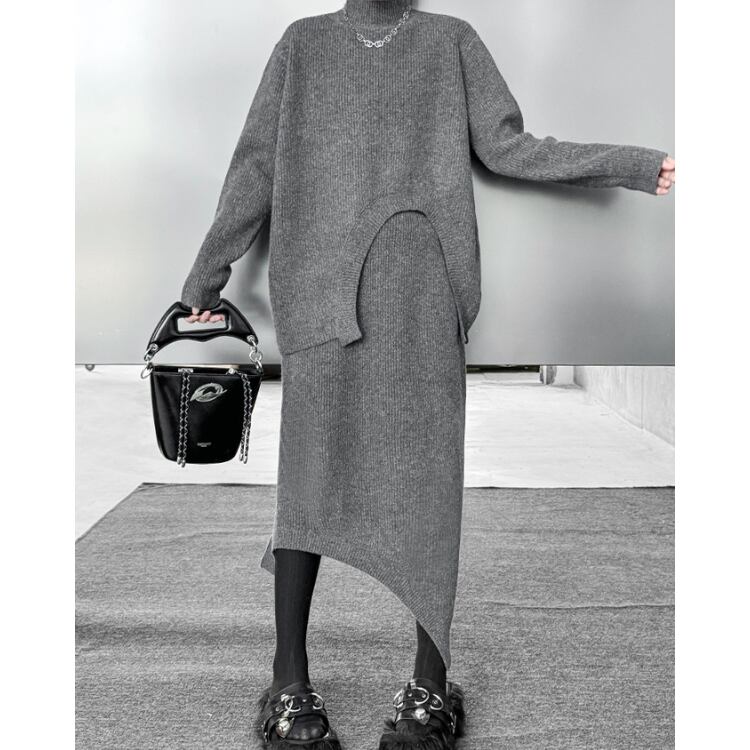 独特なカッティングラインが目を引くニットトップスとスカートのセットアップ。