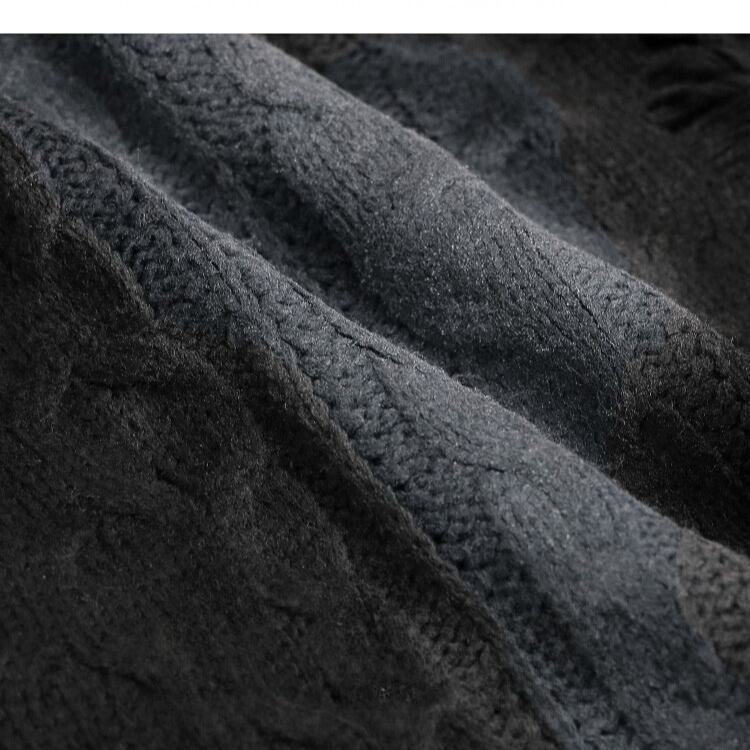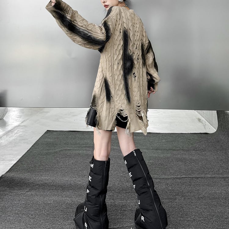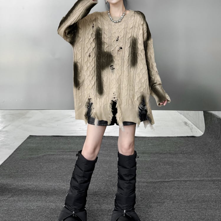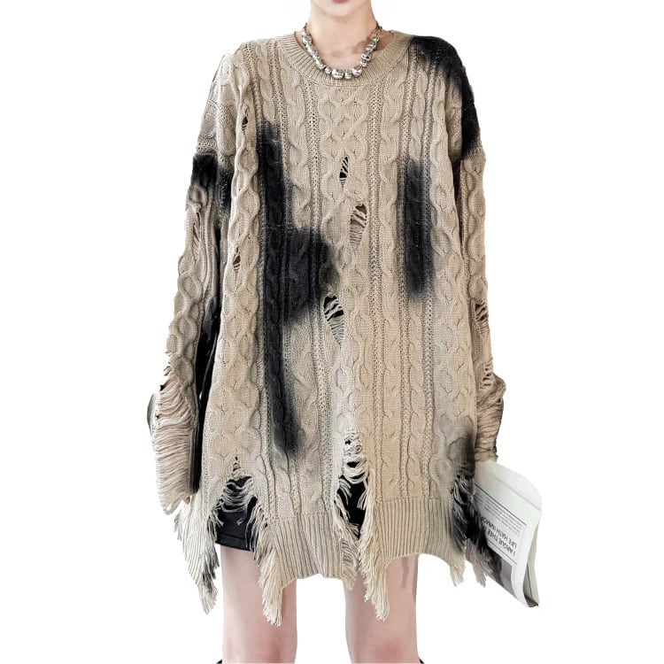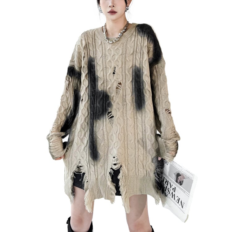 大胆なダメージ加工とスプレーアート風のカラーリングを施したケーブルニット。立体的な編み模様に無造作なほつれを組み合わせ、ストリート感と抜け感を演出します。ルーズシルエットでユニセックスに着用可能。コーデの主役になる存在感のある1枚です。