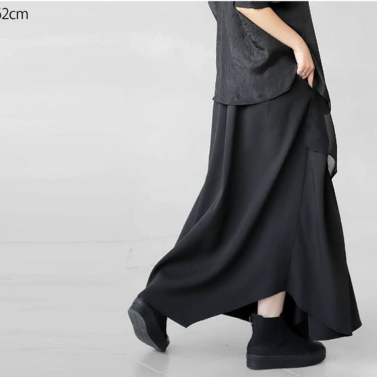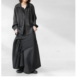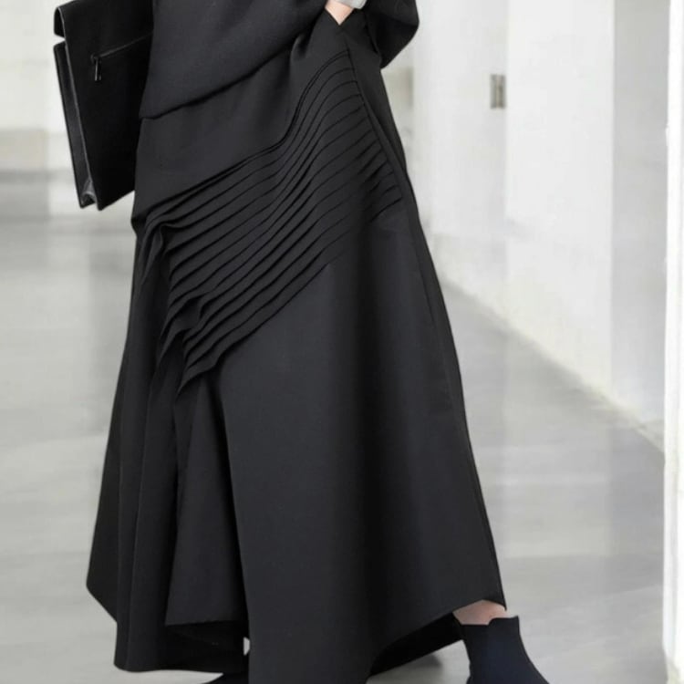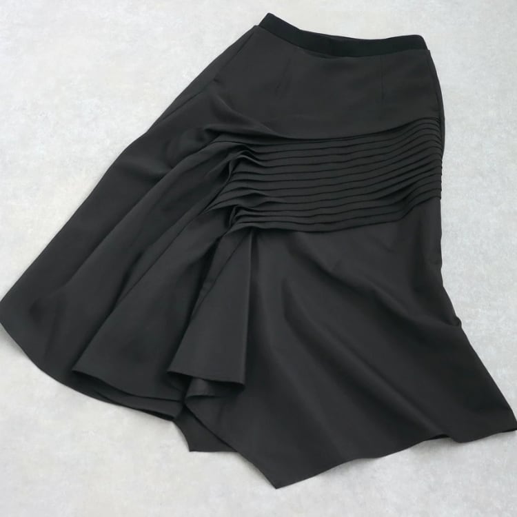 片側に細かなプリーツを斜めに配置した、動きのあるシルエットが魅力のロングスカートです。生地の落ち感を活かしたフレアラインが歩くたびに自然な揺れを生み、シンプルなトップスを合わせるだけで印象的なスタイリングが完成します。