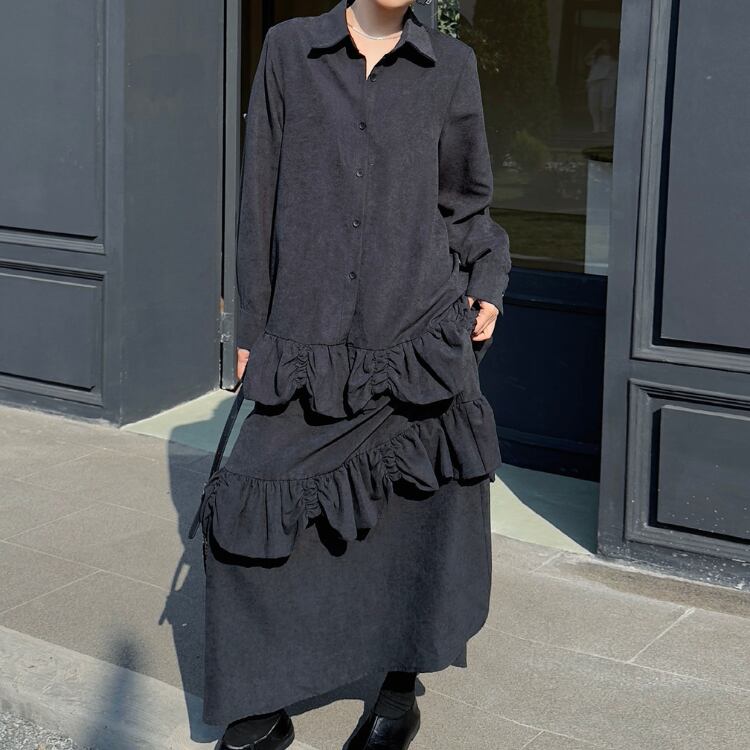 スカートはアシンメトリーに重ねたフリル切り替えが特徴で、動きに合わせて自然な立体感が生まれます。